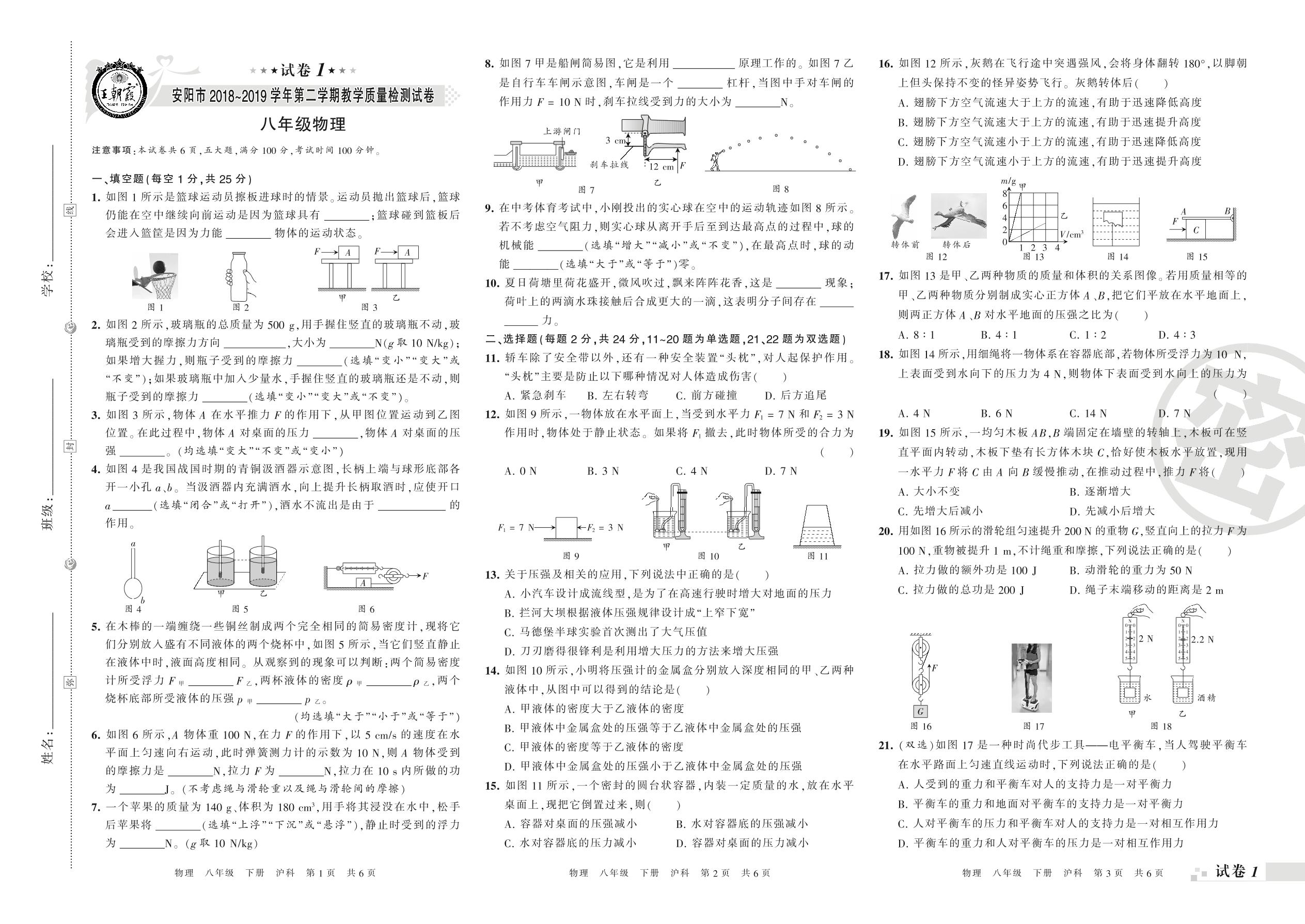 2018-2019学年第二学期安阳市八年级物理试卷(沪科版)_R210810163626【1】