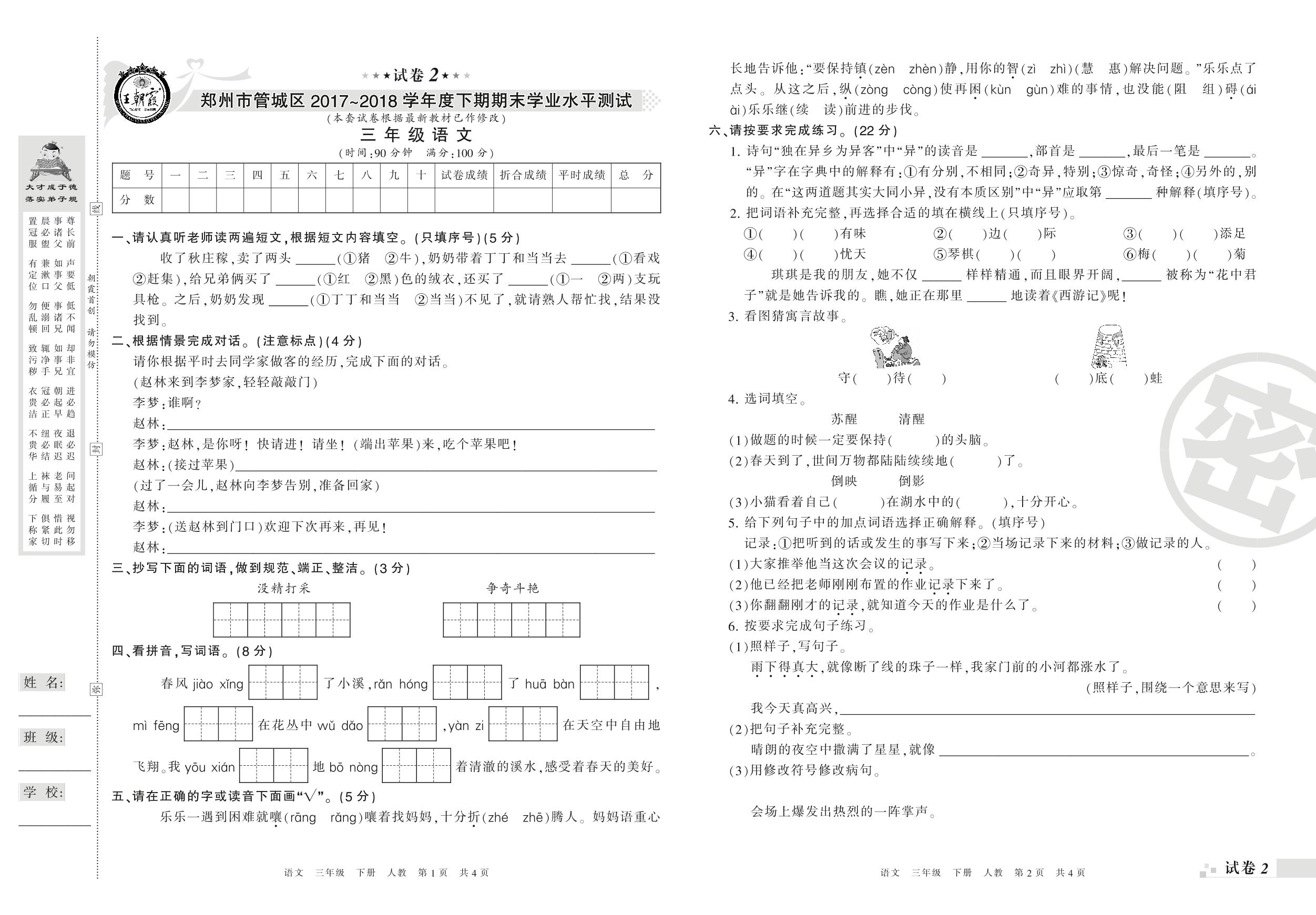 2017-2018学年第二学期郑州市管城区三年级语文试卷(人教版)【2】