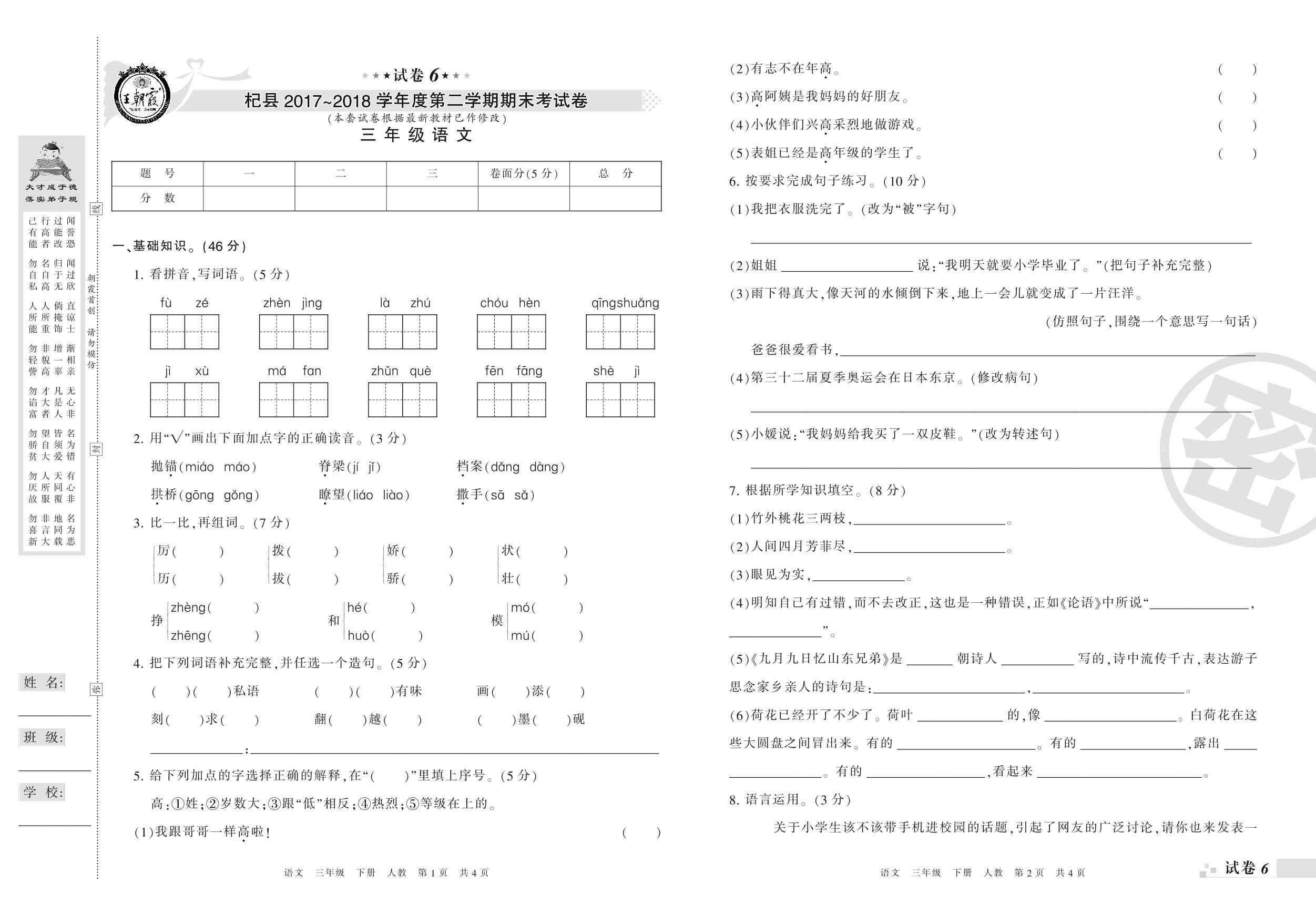 三年级语文人教版下册期末卷