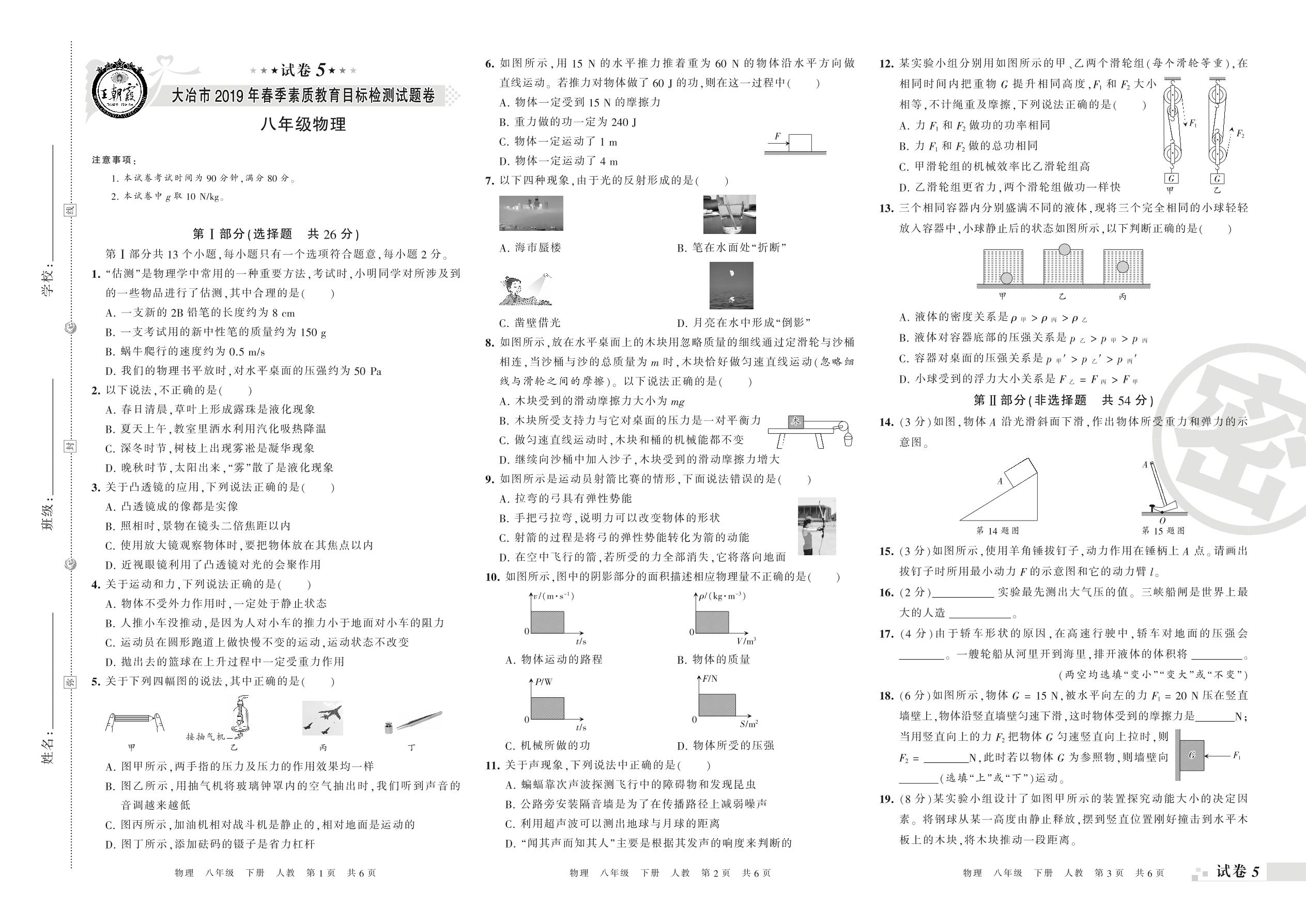 2018-2019学年第二学期大冶市八年级物理试卷(人教版)【5】