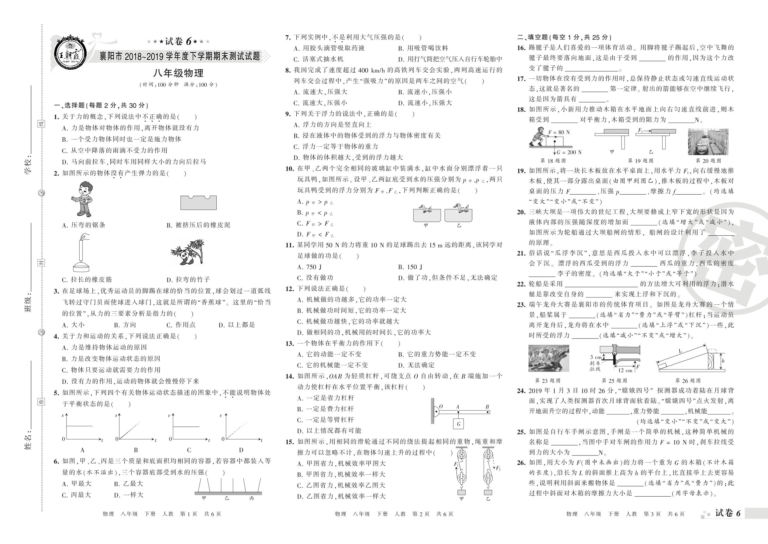 2018-2019学年第二学期襄阳市八年级物理试卷(人教版)【6】