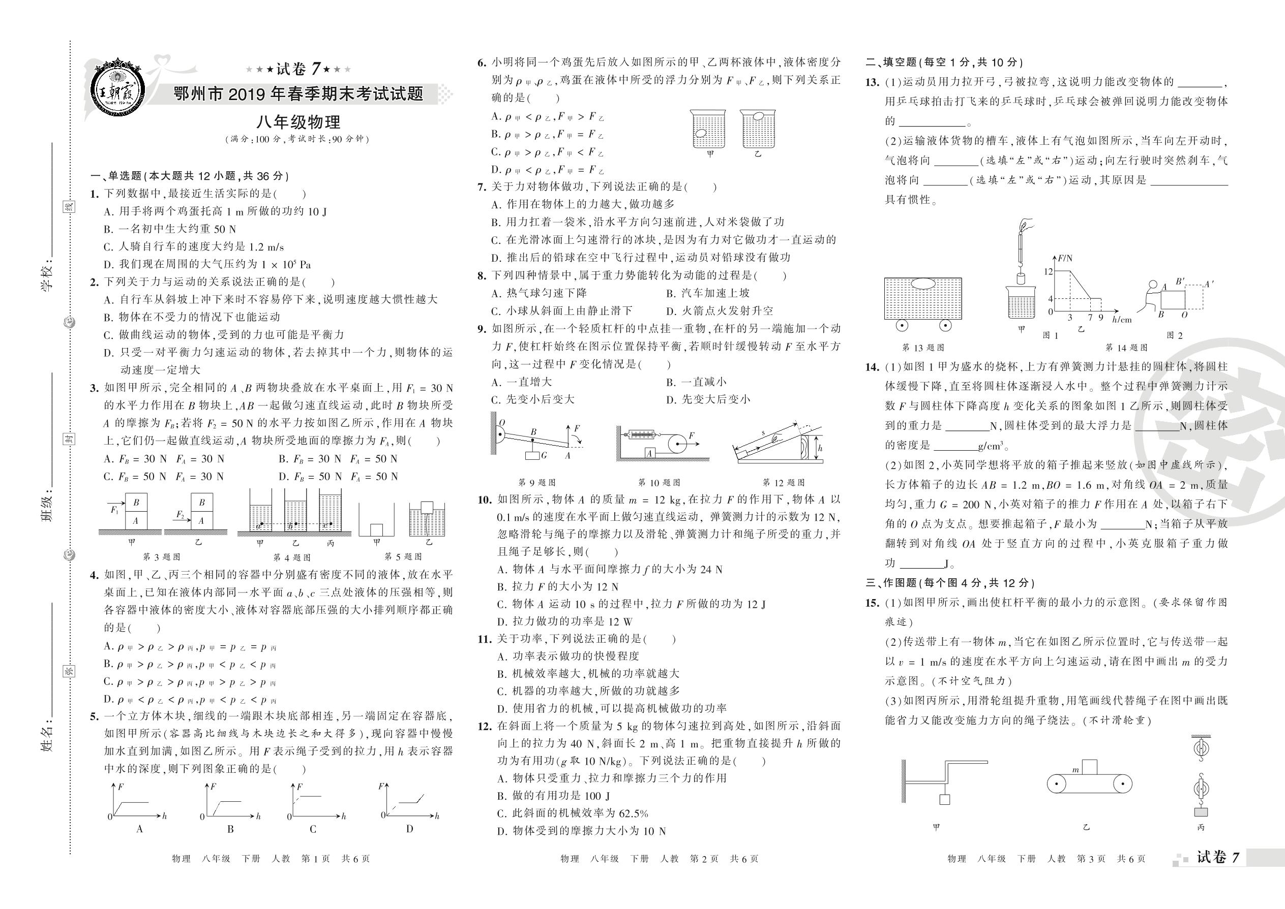 2018-2019学年第二学期鄂州市八年级物理试卷(人教版)【7】