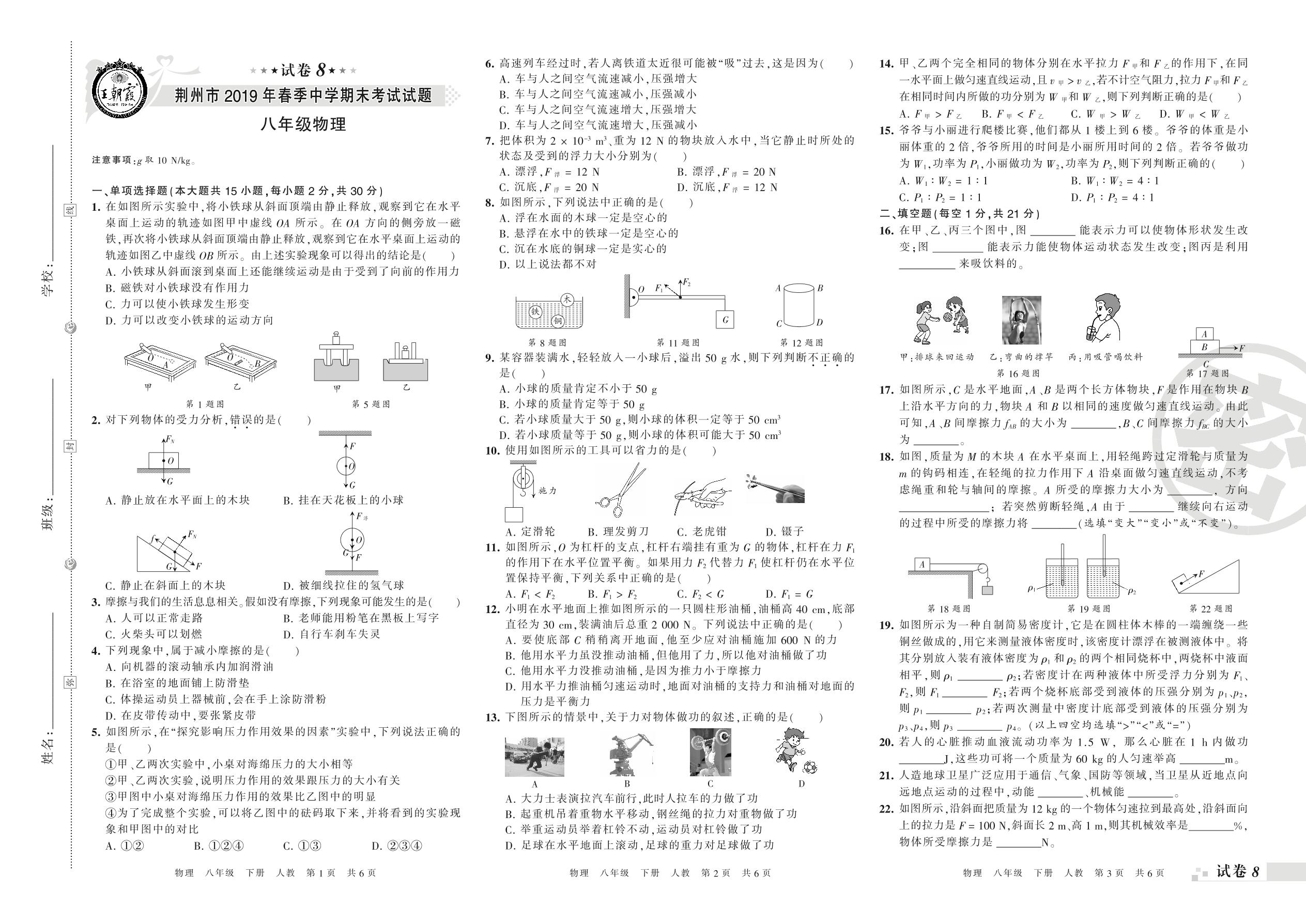 2018-2019学年第二学期荆州市八年级物理试卷(人教版)【8】