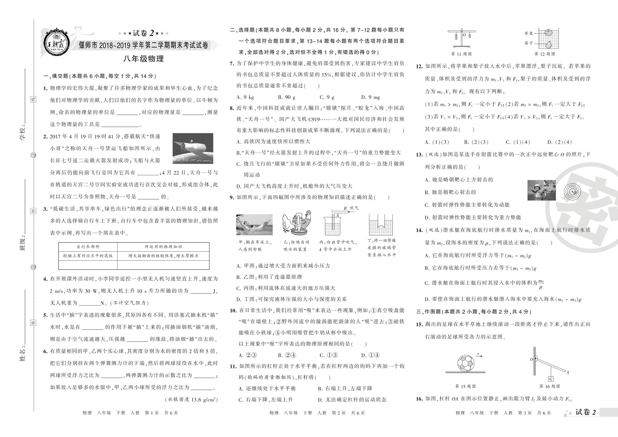 2018-2019学年第二学期偃师市八年级物理试卷(人教版)【2】