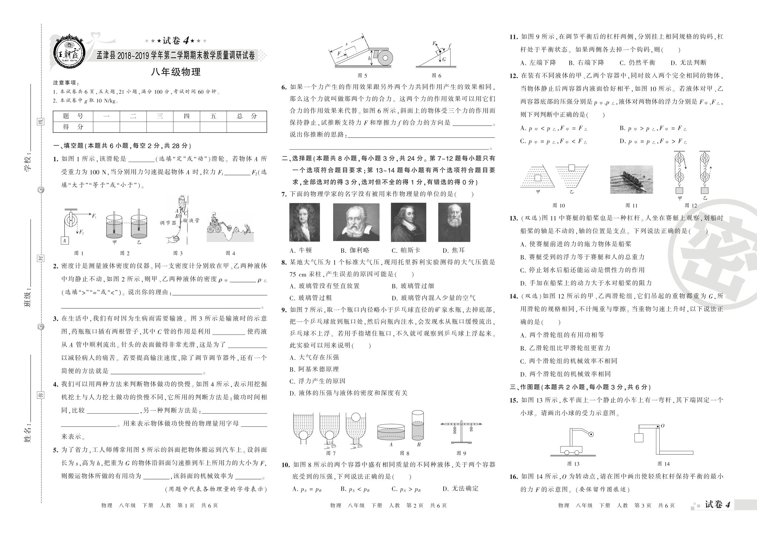 2018-2019学年第二学期洛阳市孟津县八年级物理试卷(人教版)【4】