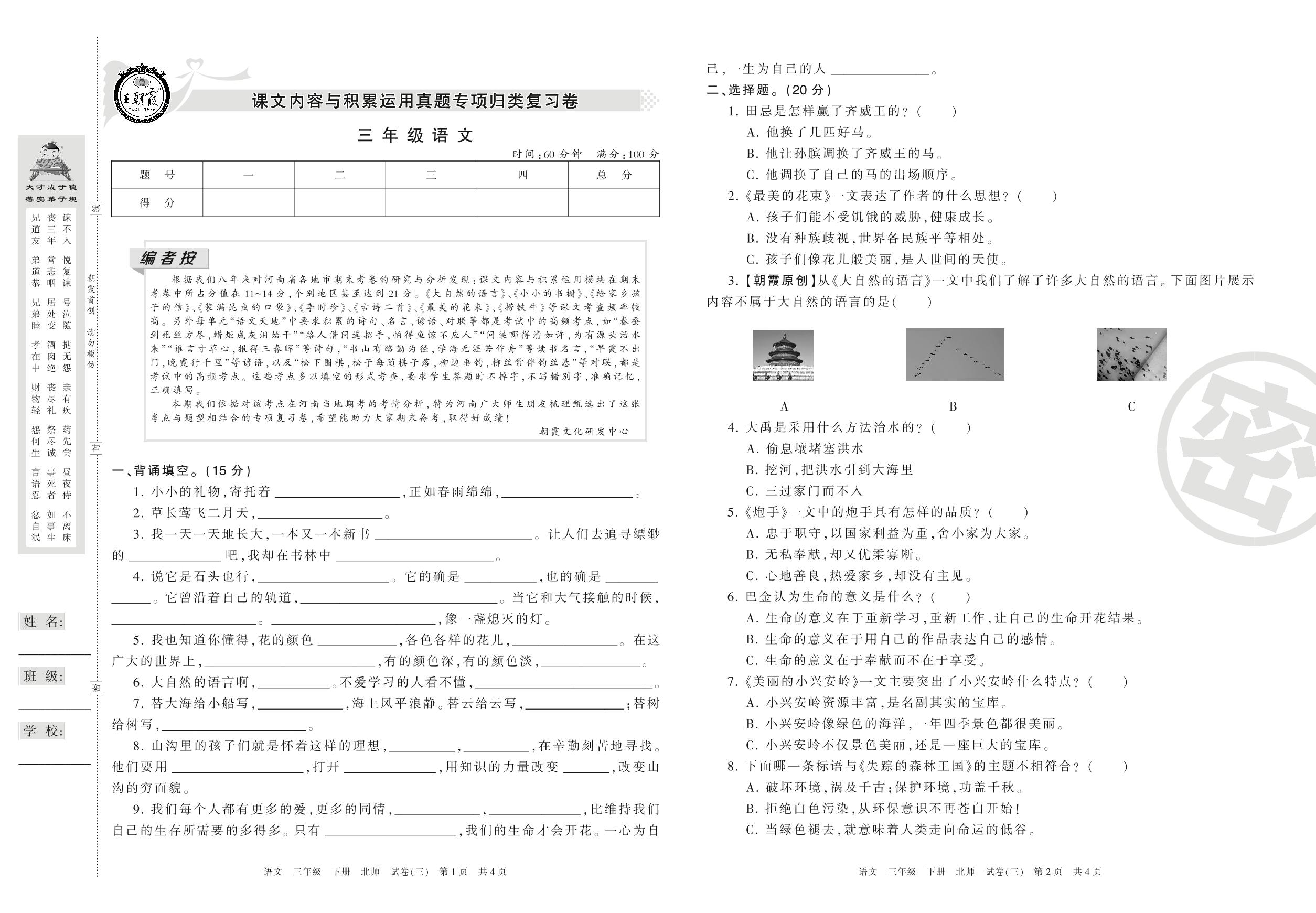 王朝霞期末专项卷三年级下册语文(北师版)_R21080193411【3】