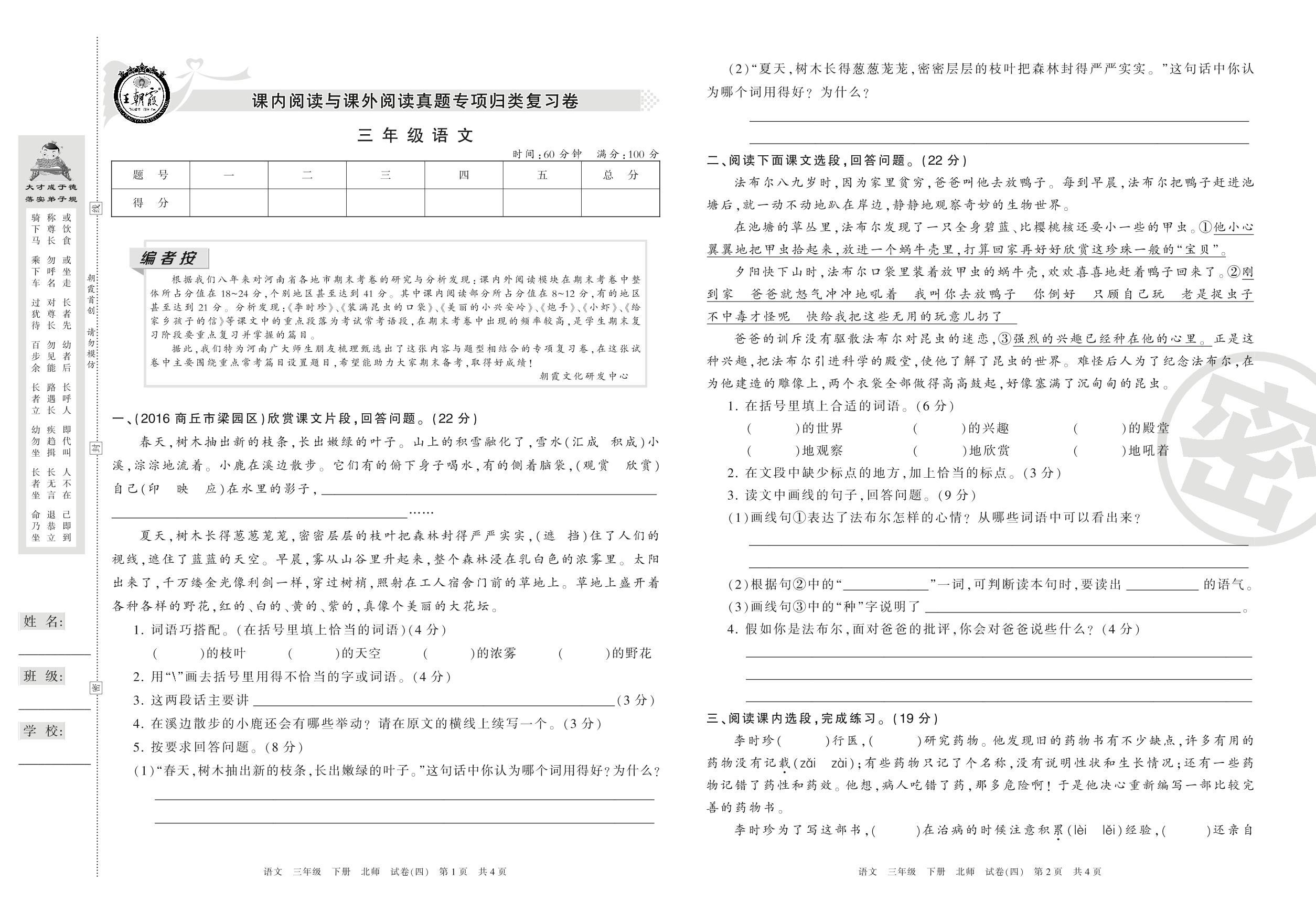王朝霞期末专项卷三年级下册语文(北师版)_R21080193418【4】