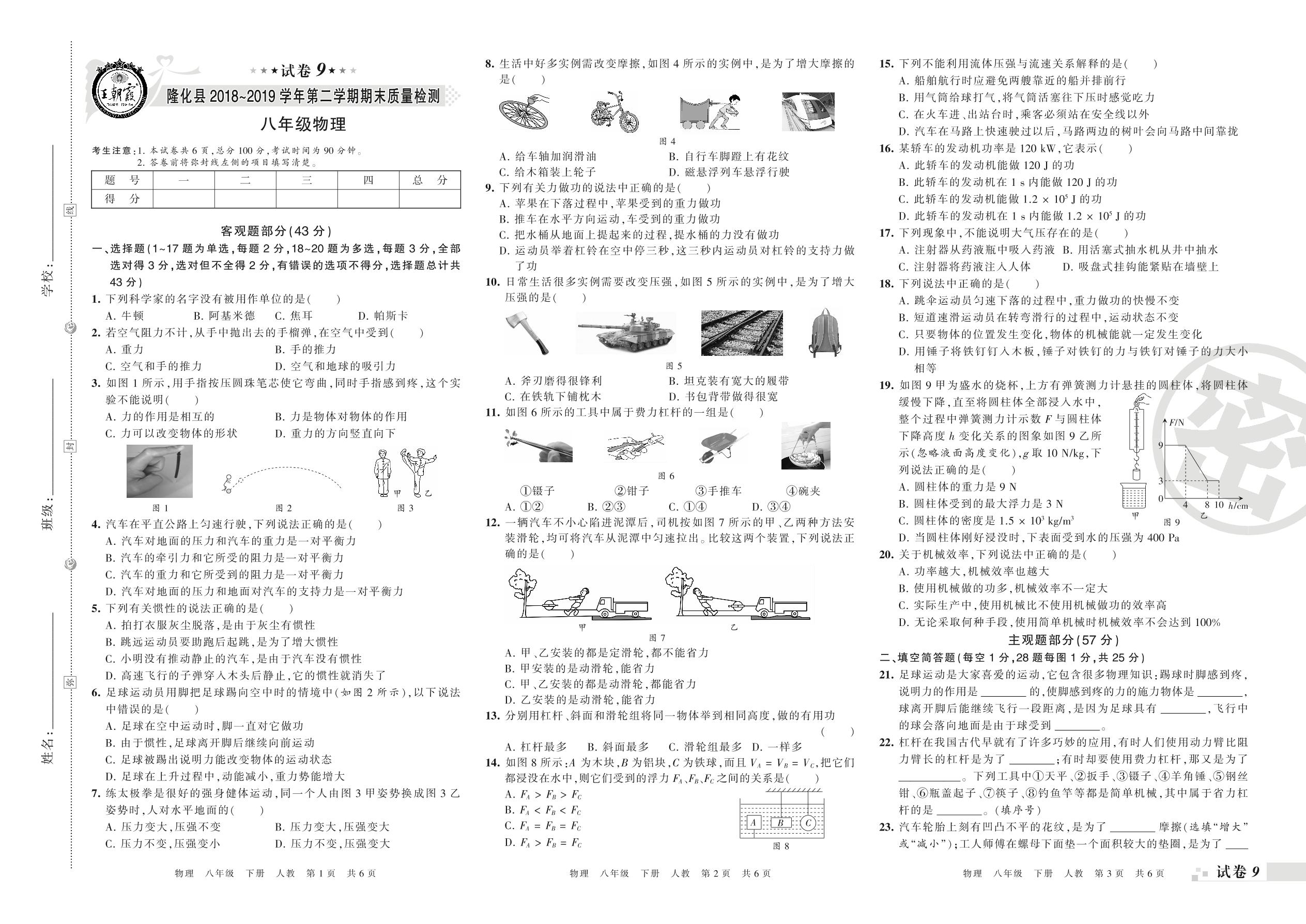 2018-2019学年第二学期承德市隆化县八年级物理试卷(人教版)【9】