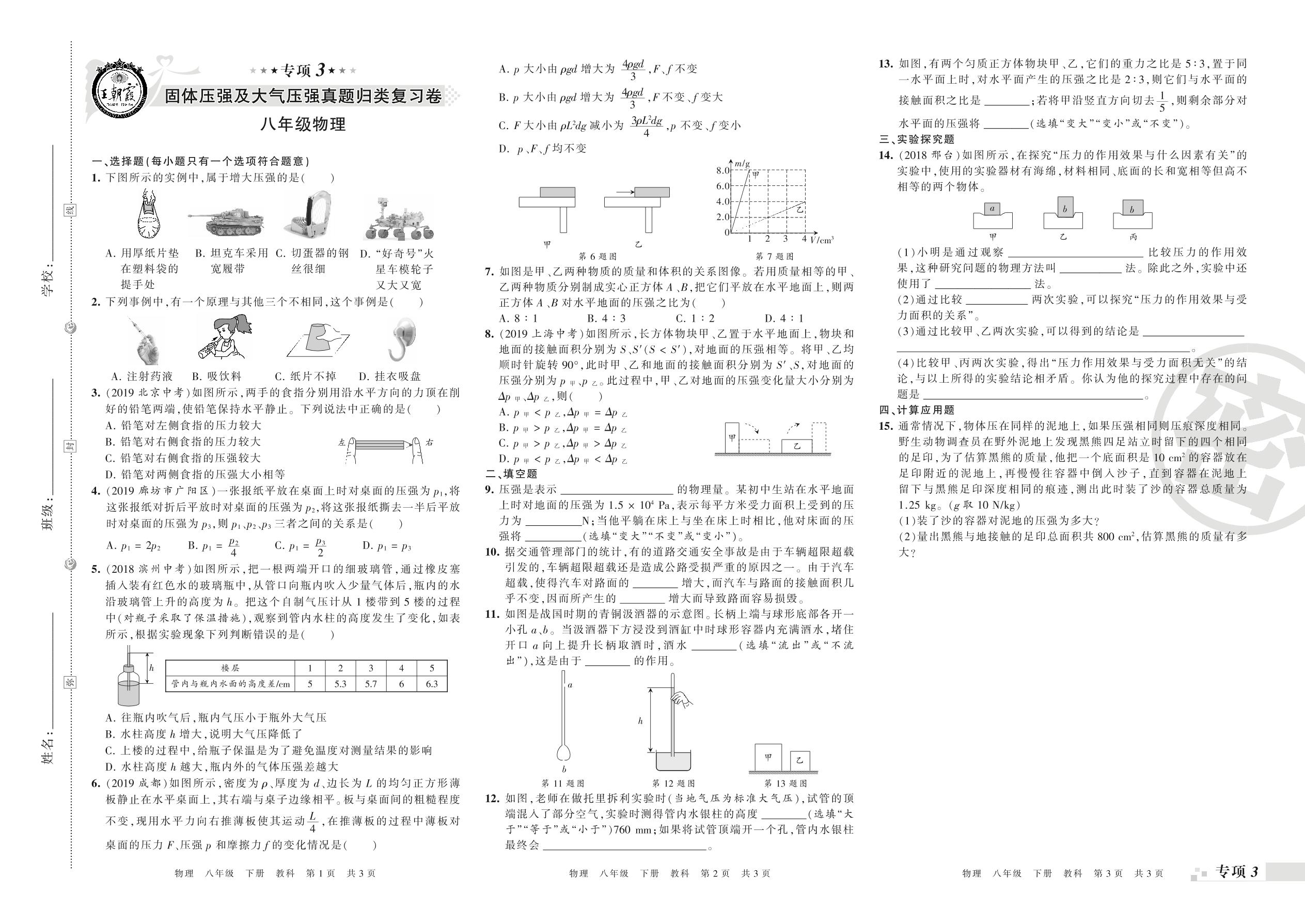王朝霞期末专项卷——固体压强及大气压强、液体压强真题归类复习卷八年级下册物理(教科版)_R210810165937【0】