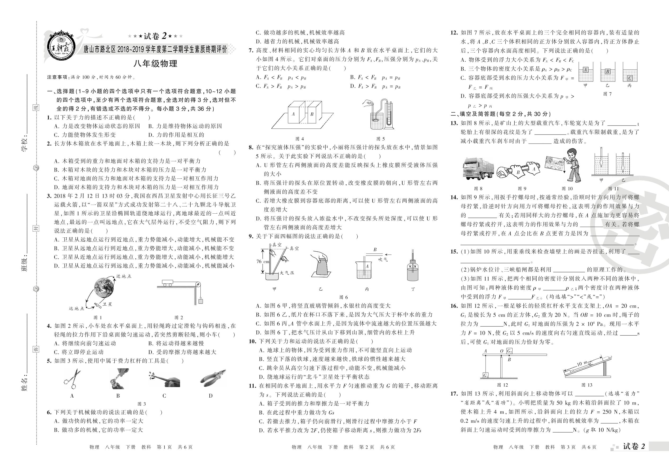 2018-2019学年第二学期唐山市路北区八年级物理试卷(教科版)【2】
