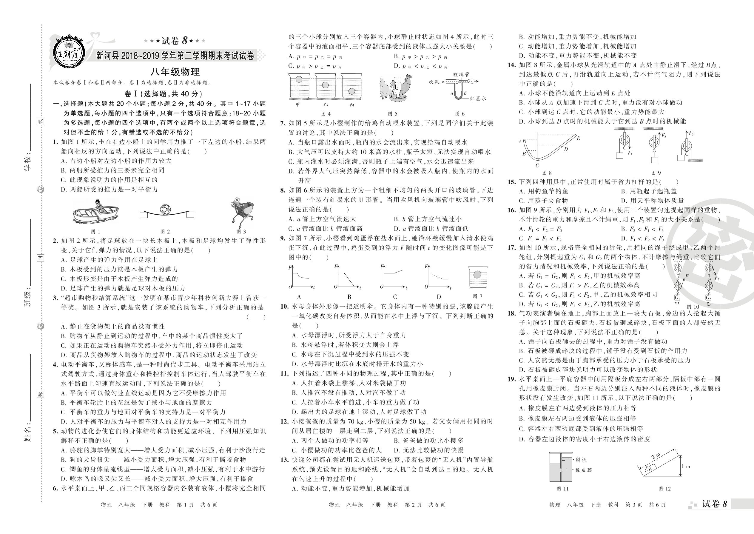 2018-2019学年第二学期邢台市新河县八年级物理试卷(教科版)【8】