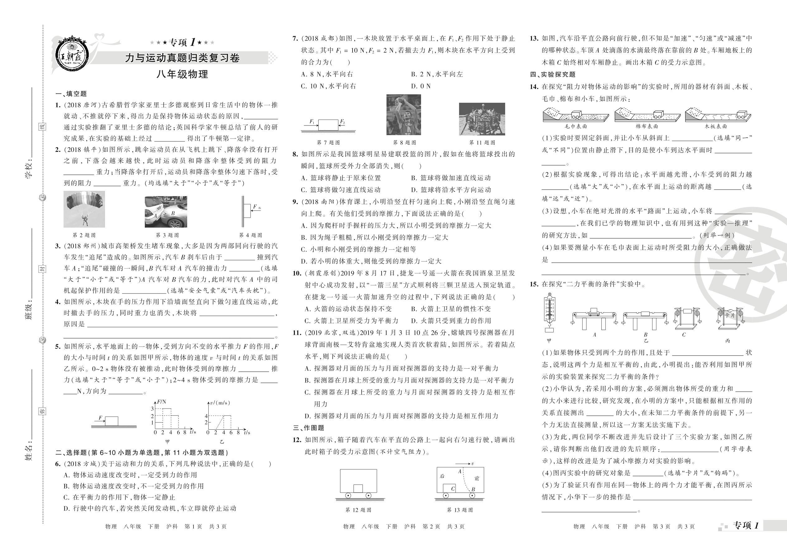 王朝霞期末专项卷——力与运动、固体压强及大气压强真题归类复习卷八年级下册物理(沪科版)_R210810170131【0】