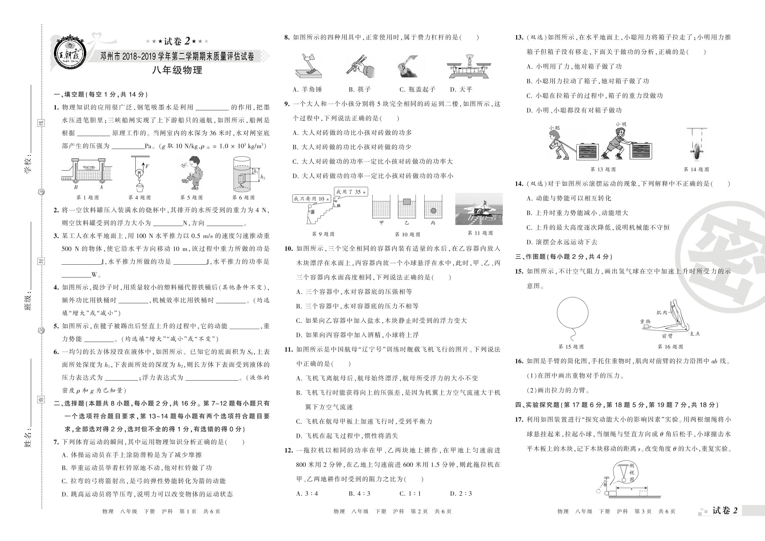 2018-2019学年第二学期邓州市八年级物理试卷(沪科版)【2】