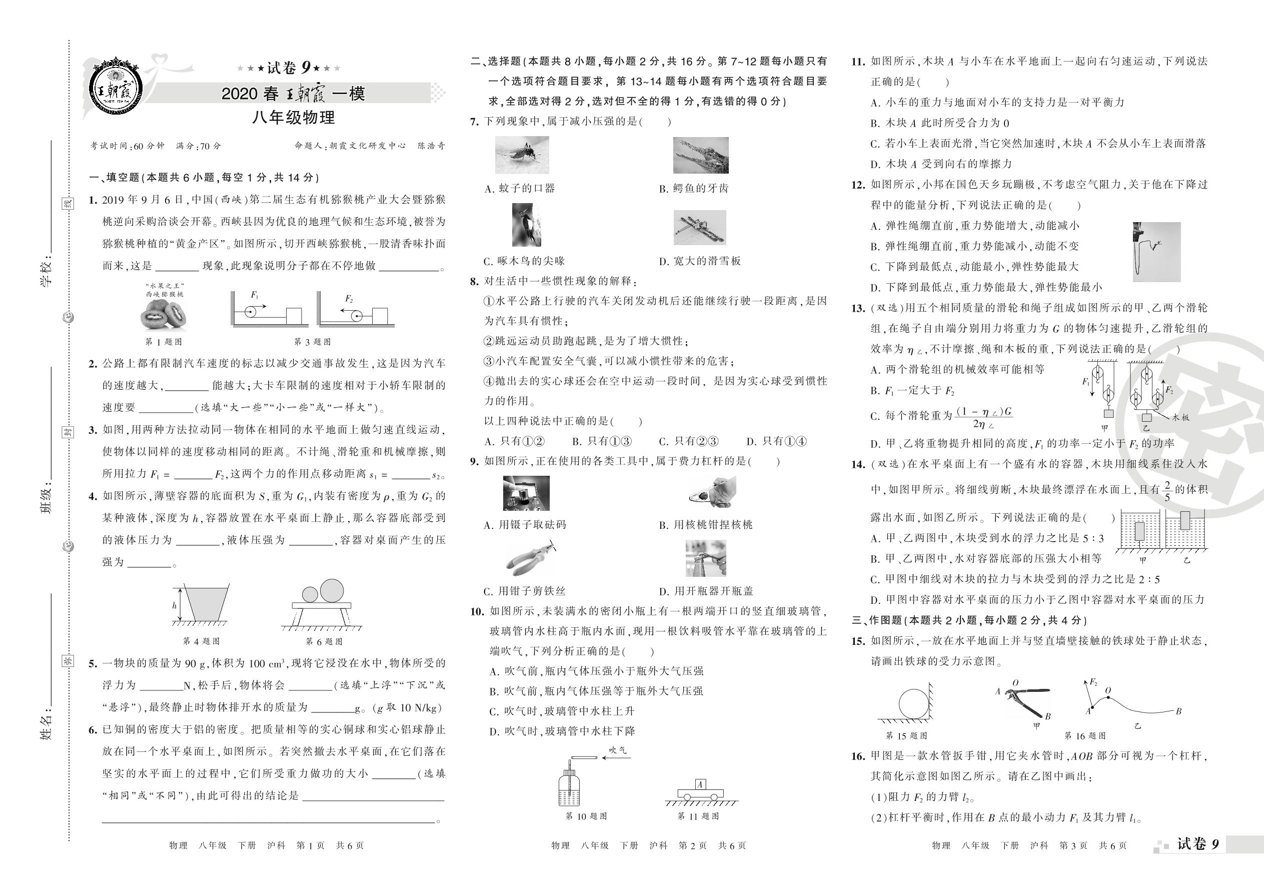 2019-2020学年第二学期王朝霞期末模拟卷八年级物理(沪科版)_R210810170319【9】