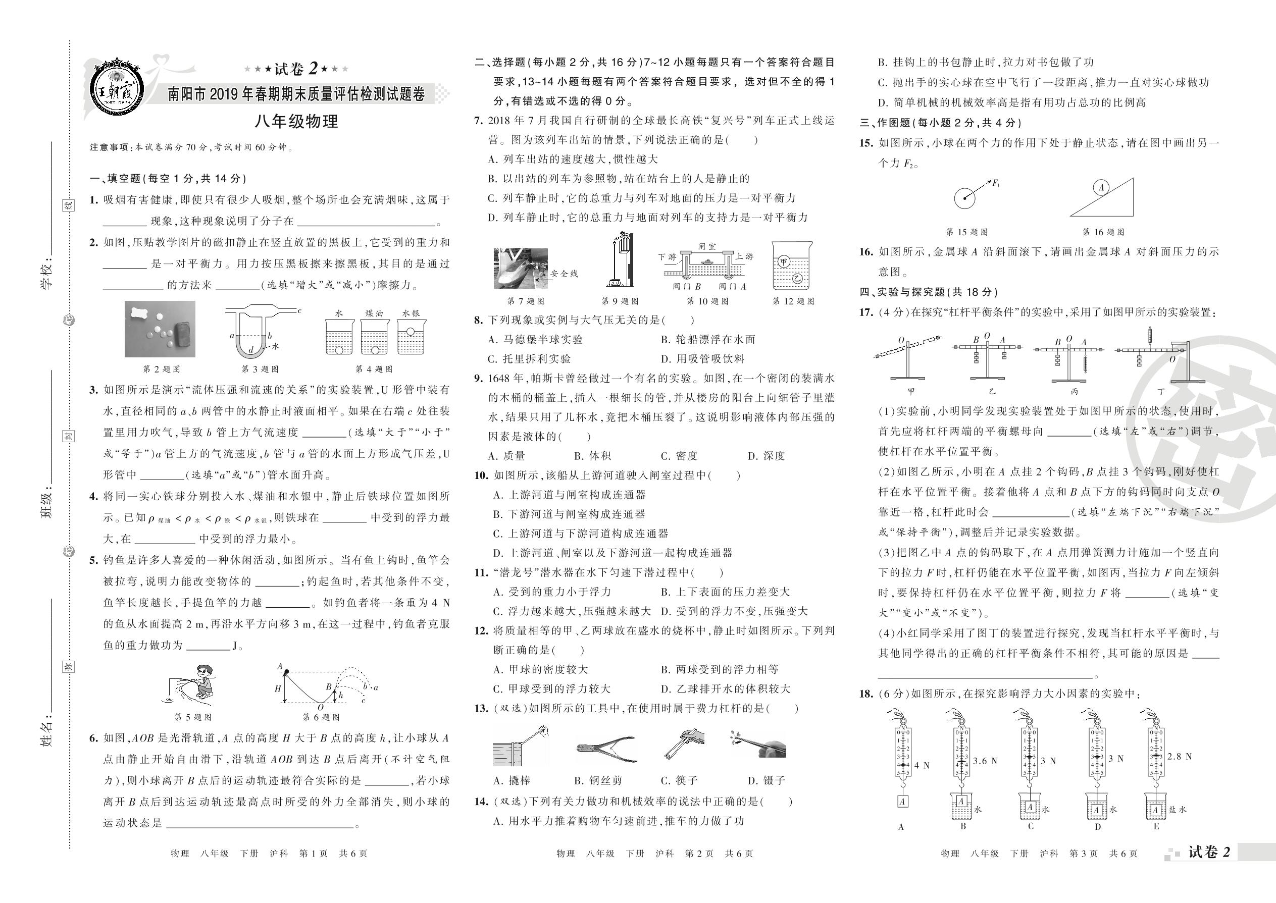 2018-2019学年第二学期南阳市八年级物理试卷(沪科版)【2】