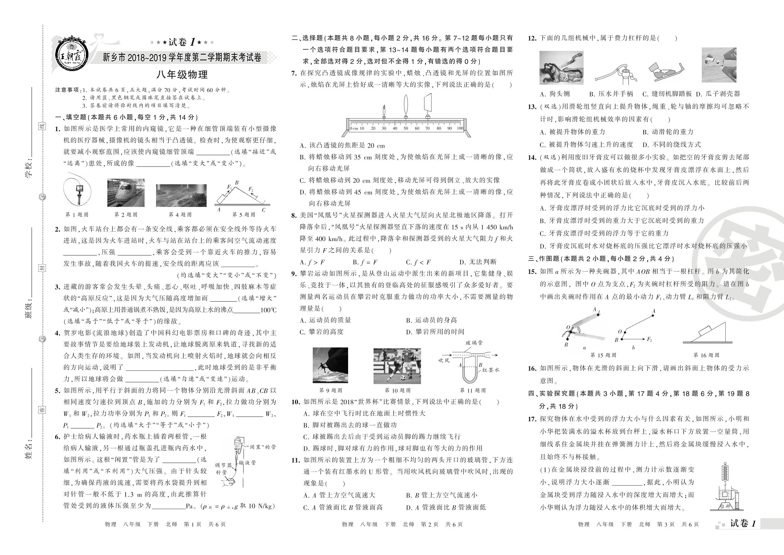 2018-2019学年第二学期新乡市八年级物理试卷(北师版)【1】
