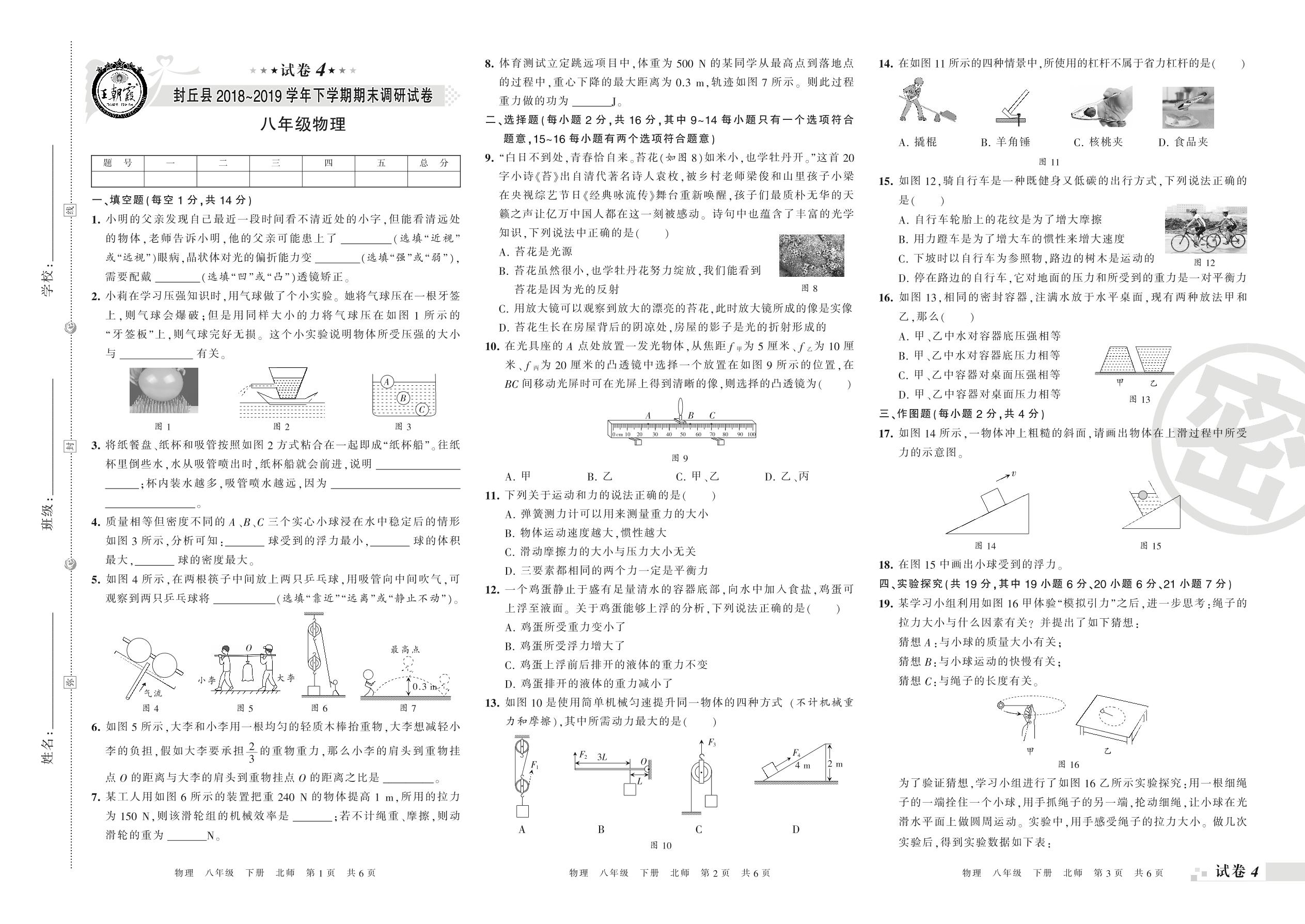 2018-2019学年第二学期新乡市封丘县八年级物理试卷(北师版)【4】