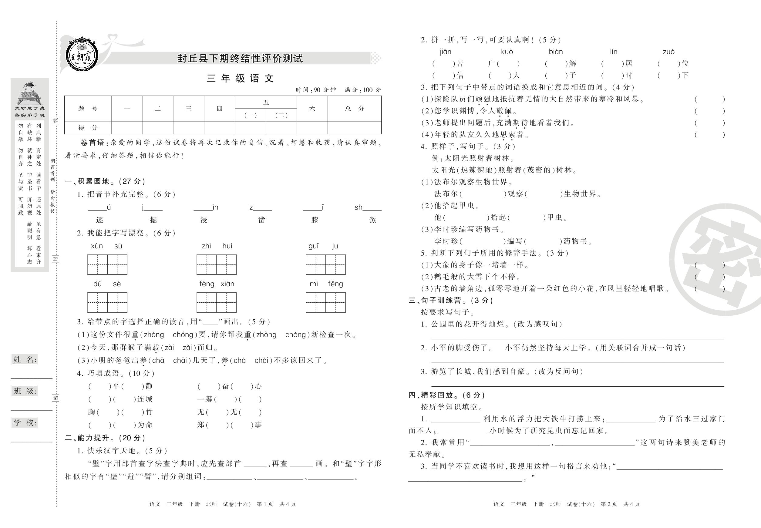 2015-2016学年第二学期新乡市封丘县三年级语文试卷(北师版)【16】