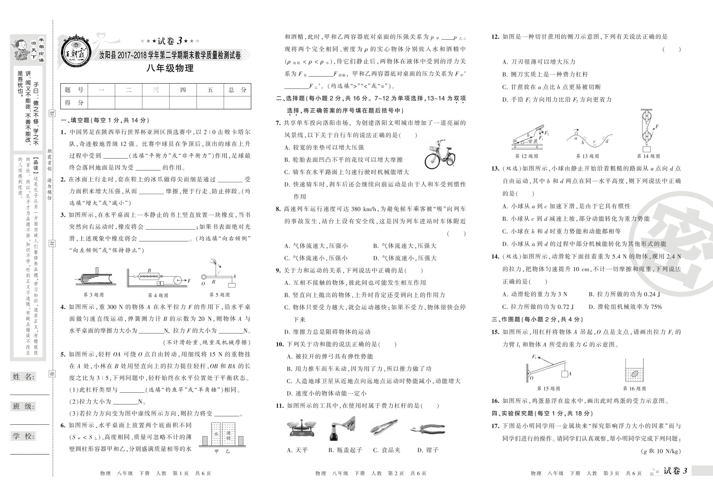 2017-2018学年第二学期汝阳市八年级物理试卷(人教版)【3】