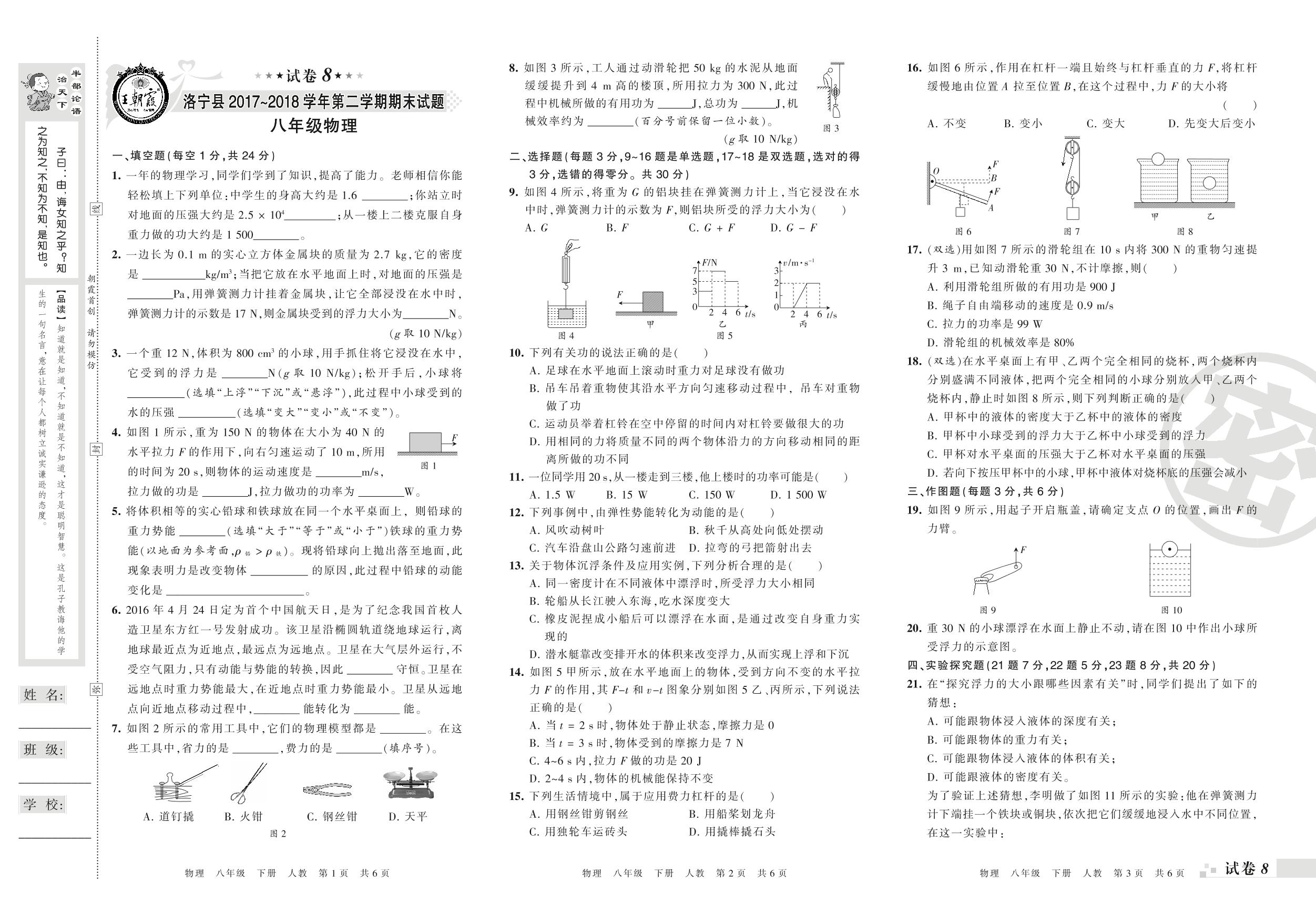 2017-2018学年第二学期洛阳市洛宁县八年级物理试卷(人教版)【8】