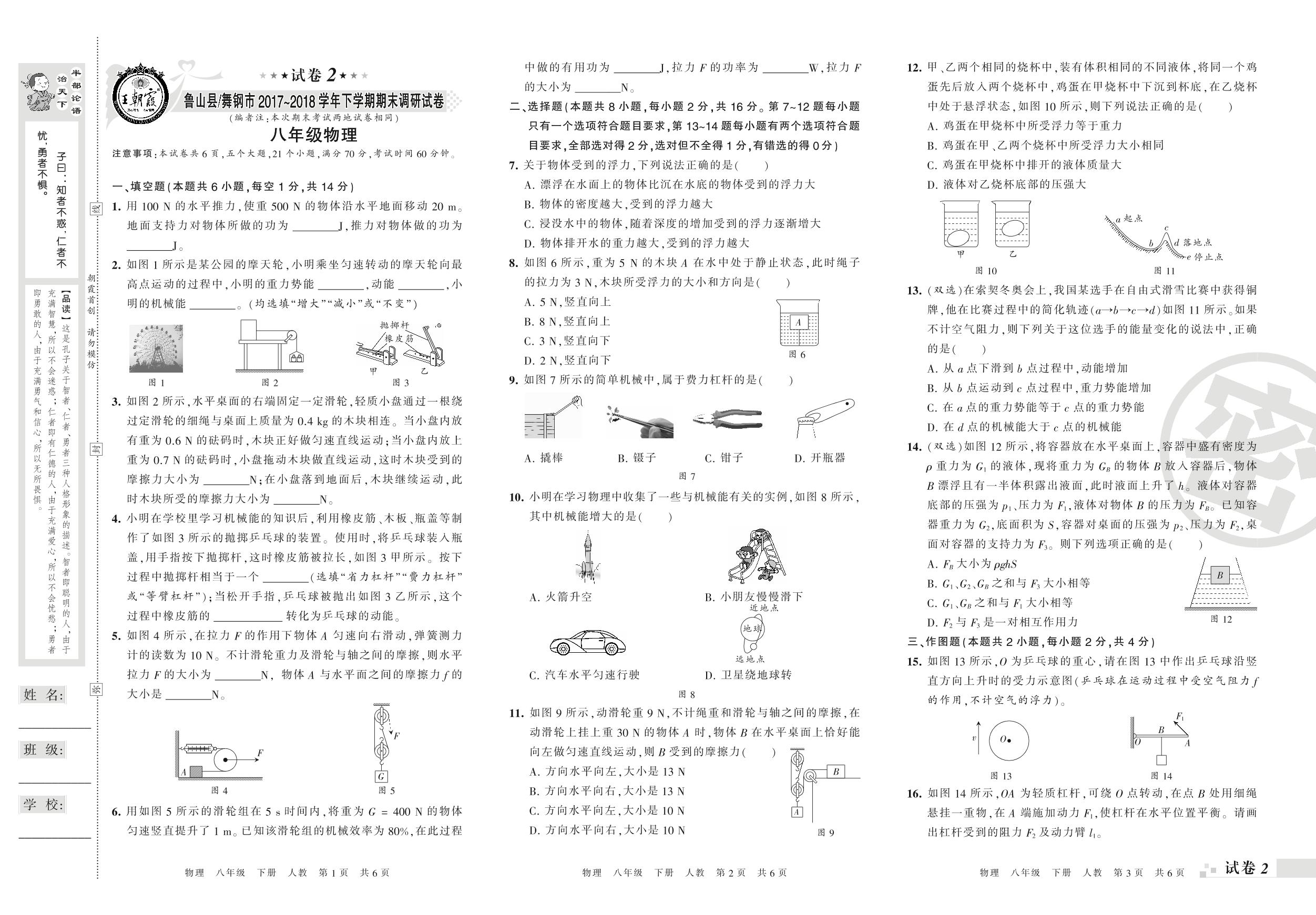 2017-2018学年第二学期鲁山县(舞钢市)八年级物理试卷(人教版)【2】