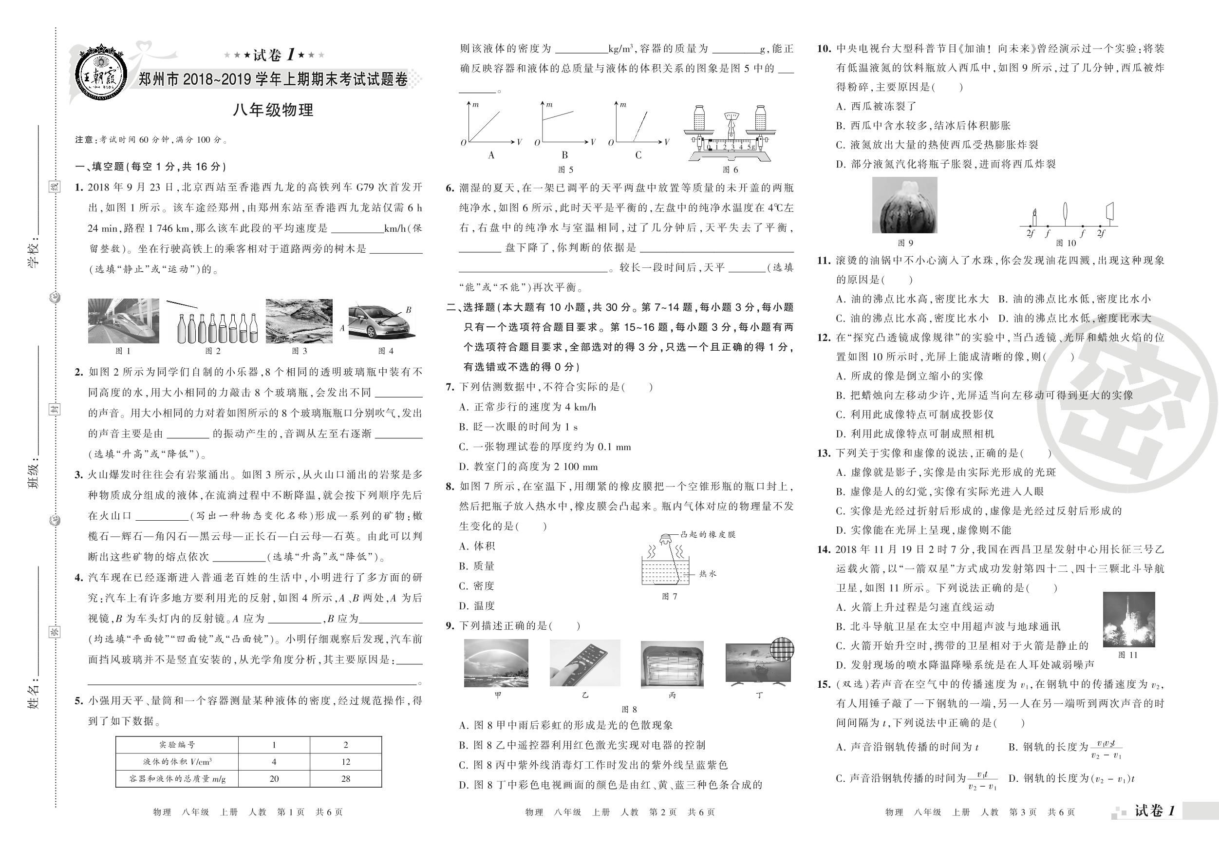 2018-2019学年第一学期郑州市八年级物理试卷(人教版)【1】