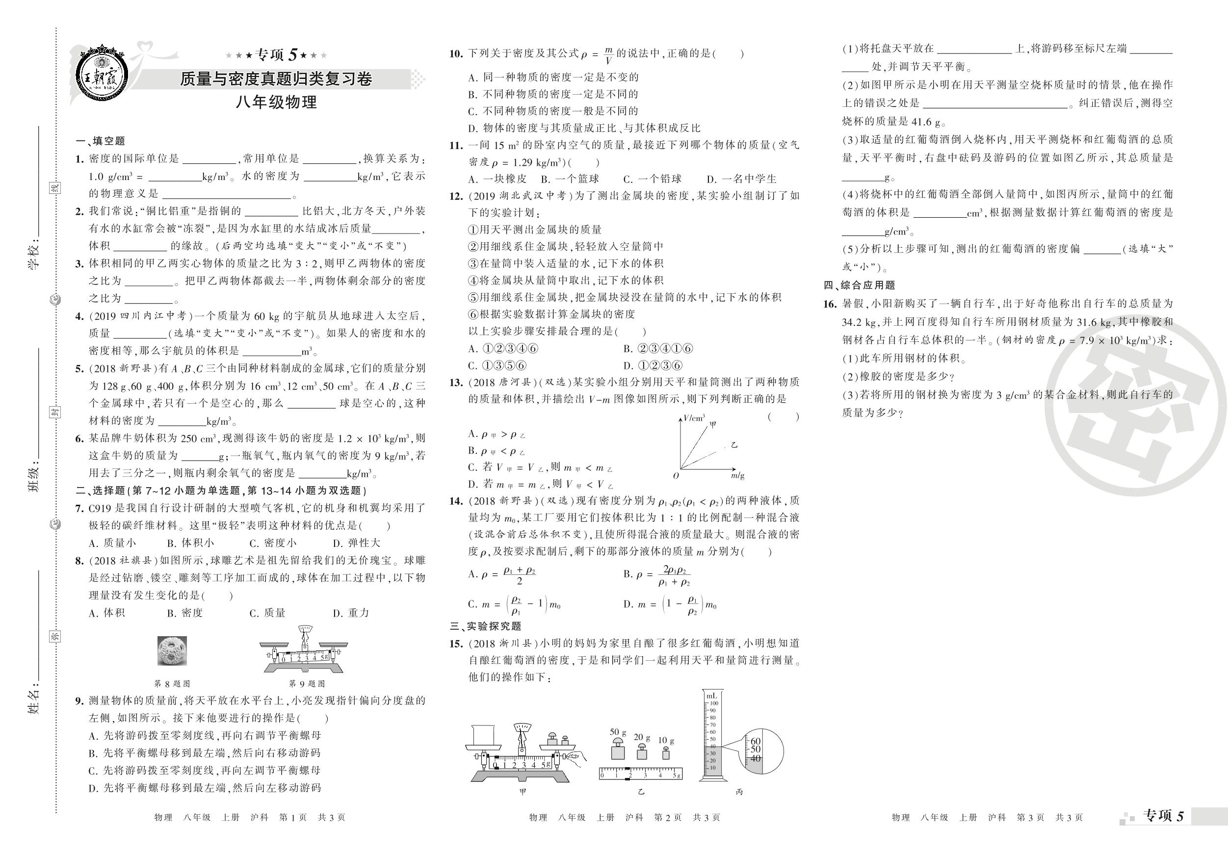 王朝霞期末专项卷——质量与密度、熟悉而陌生的力真题归类复习八年级上册物理(人教版)_R210810172031【0】