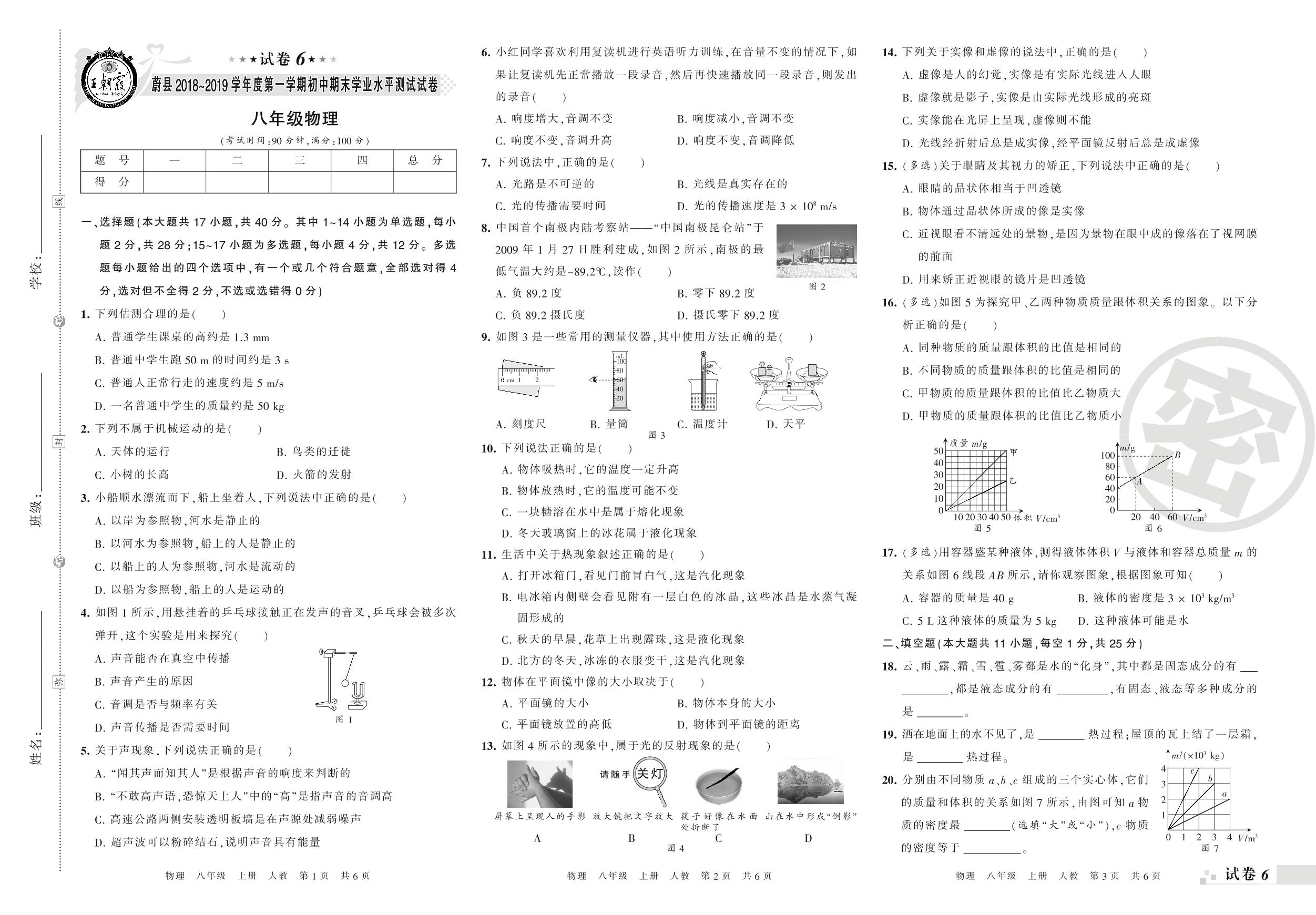 2018-2019学年第一学期张家口市蔚县八年级物理试卷(人教版)【6】