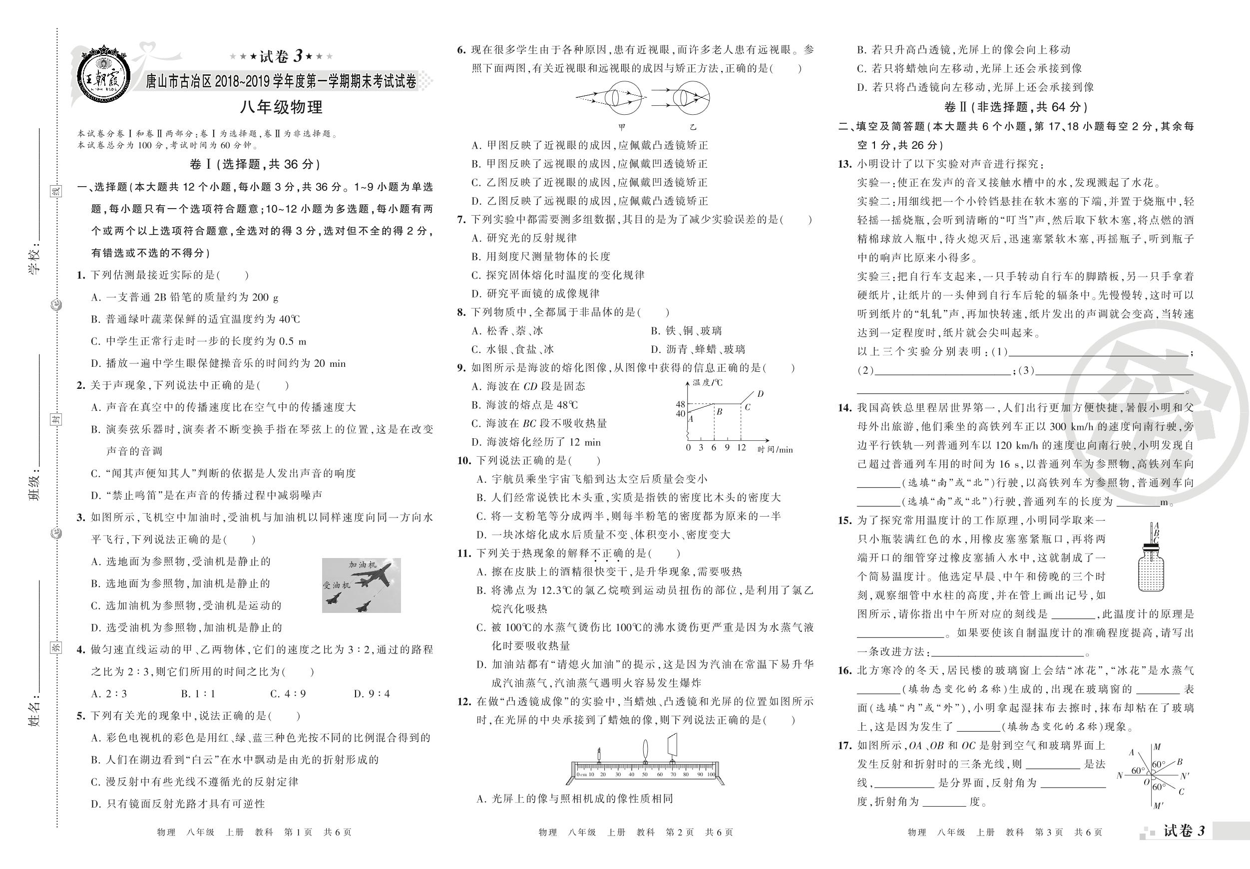 2018-2019学年第一学期唐山市古冶区八年级物理试卷(教科版)【3】