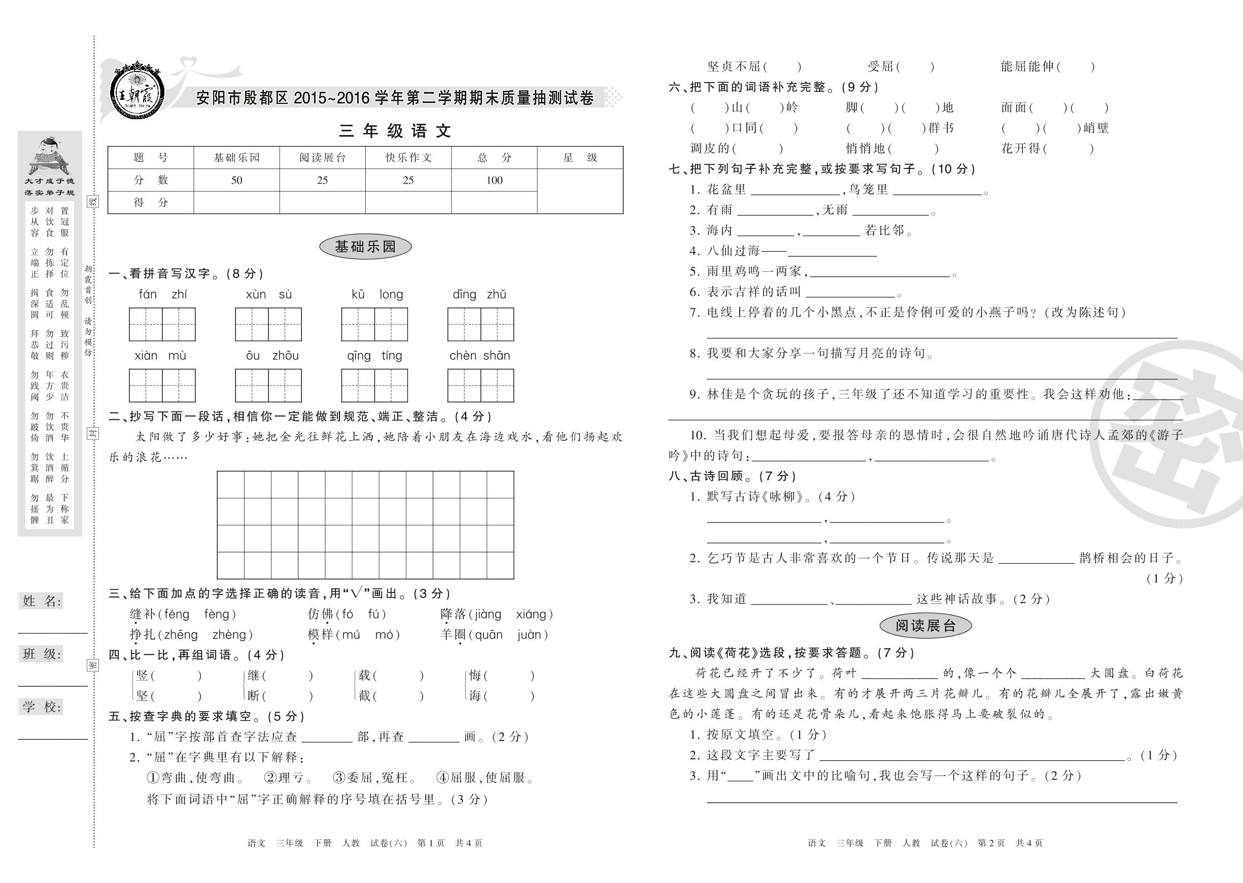 2015-2016学年第二学期安阳市殷都区三年级语文试卷(人教版)【6】