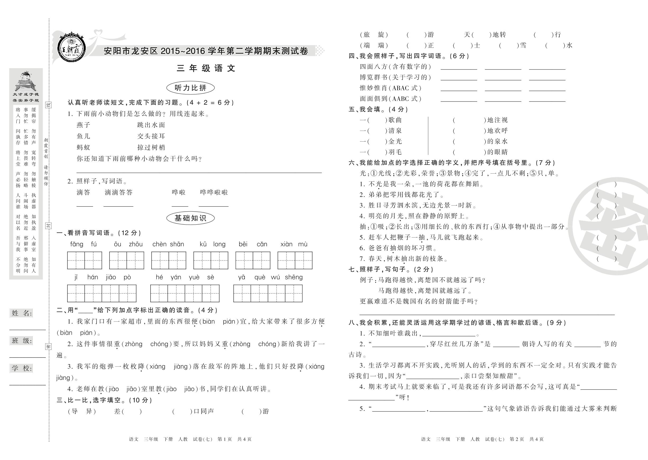 2015-2016学年第二学期安阳市龙安区三年级语文试卷(人教版)【7】
