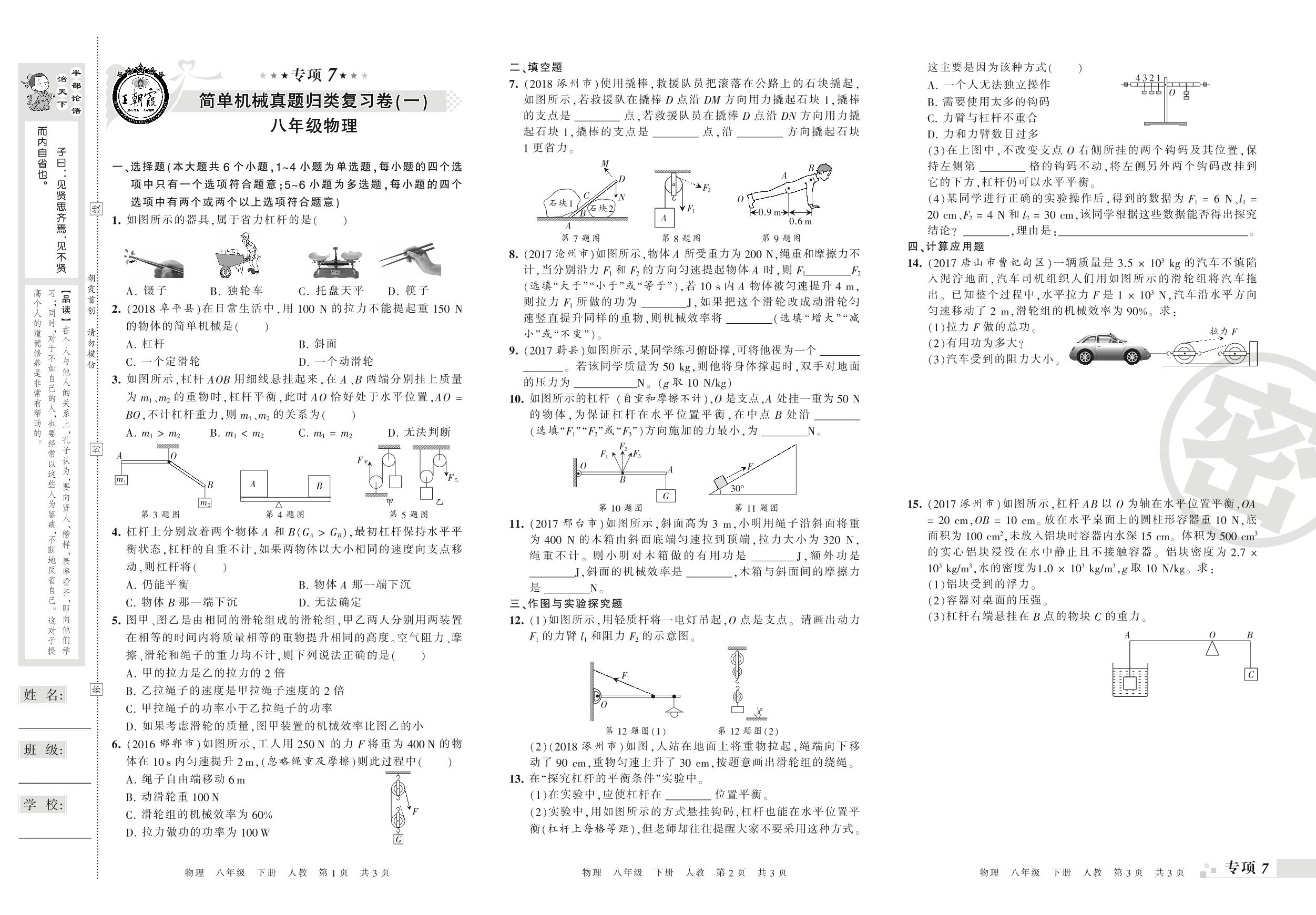 王朝霞期末专项卷——简单机械真题归类复习(一)、简单机械真题归类复习(二)八年级下册物理(人教版)_R210810173159【0】