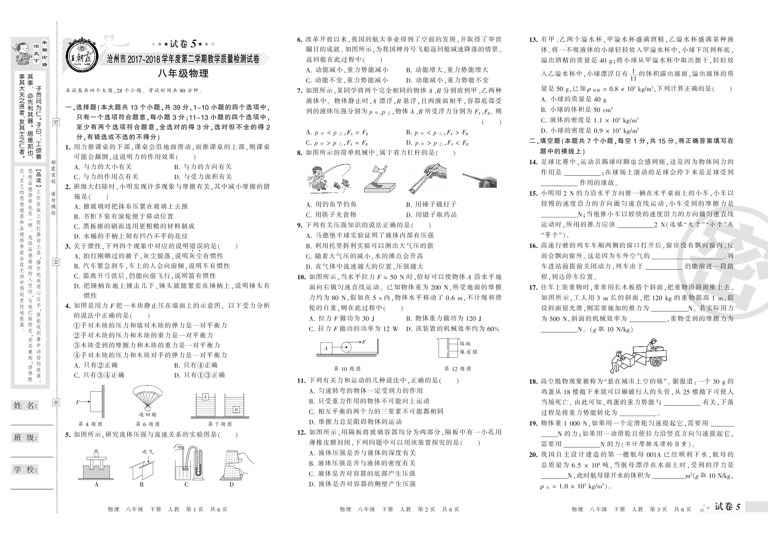 2017-2018学年第二学期沧州市八年级物理试卷(人教版)【5】