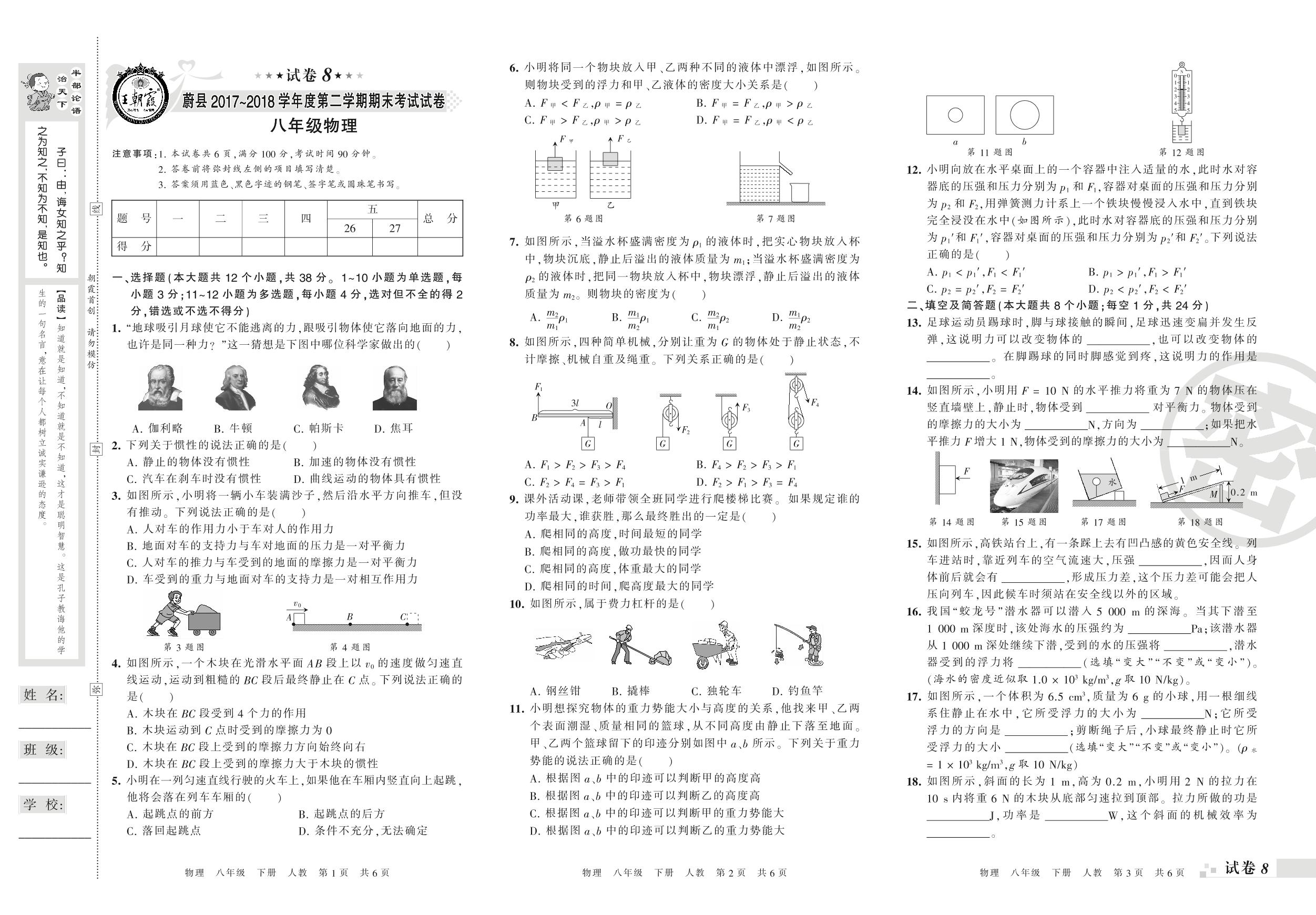 八年级物理人教版下册期末卷