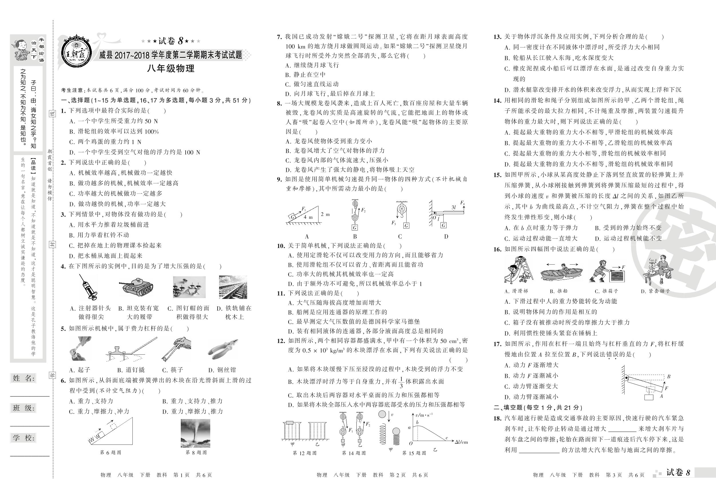 2017-2018学年第二学期邢台市威县八年级物理试卷(教科版)【8】