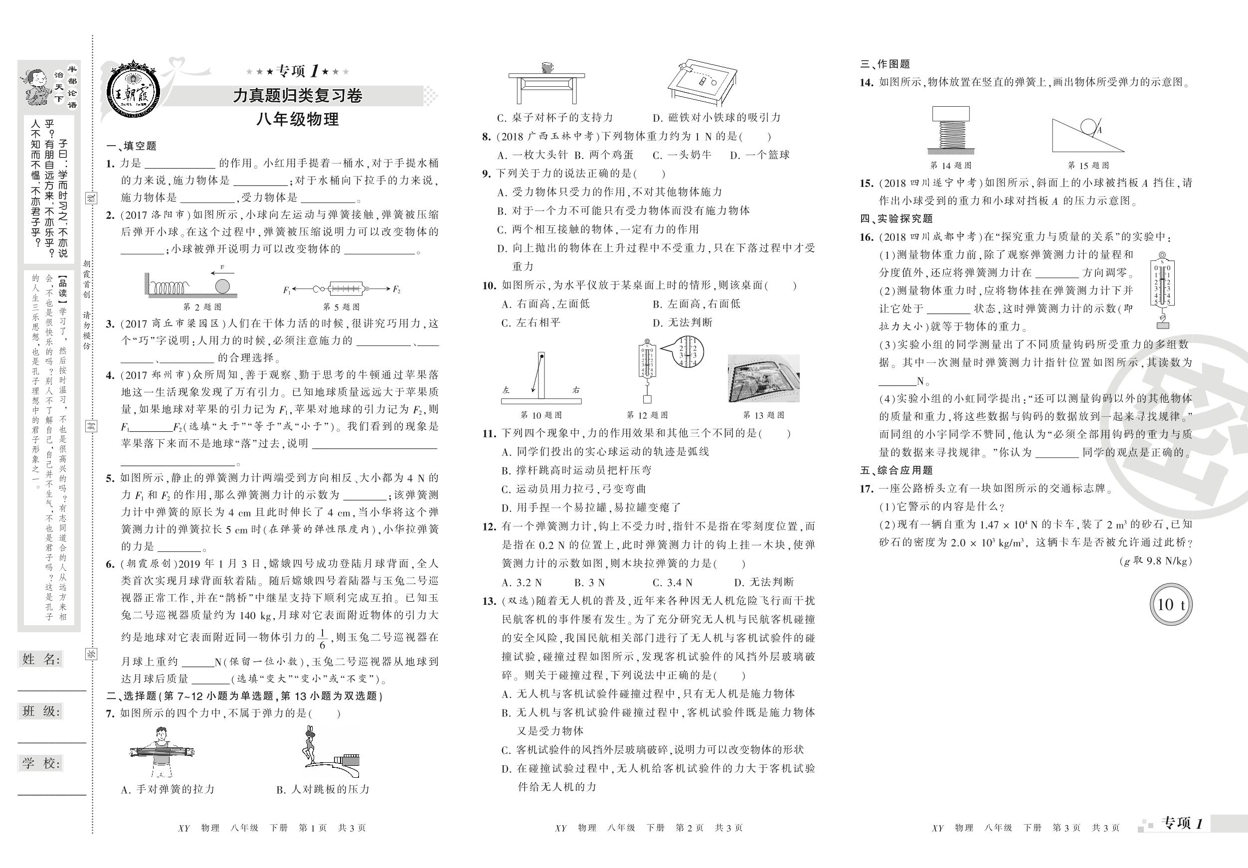 王朝霞期末专项卷——力真题归类复习、运动和力真题归类复习八年级下册物理(人教版)_R210810173534【0】