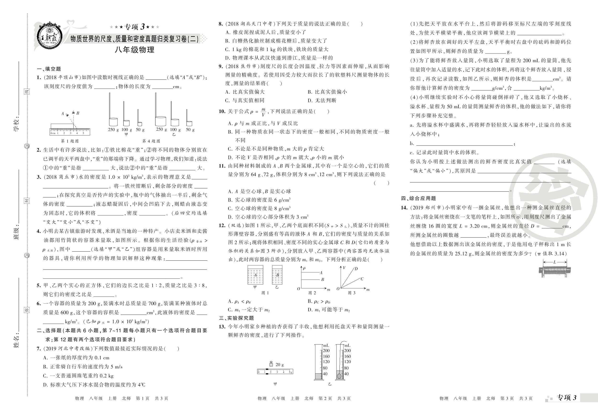 王朝霞期末专项卷——物质世界的尺度、质量和密度、物质的简单运动真题归类复习八年级上册物理(北师版)_R210810173750【0】