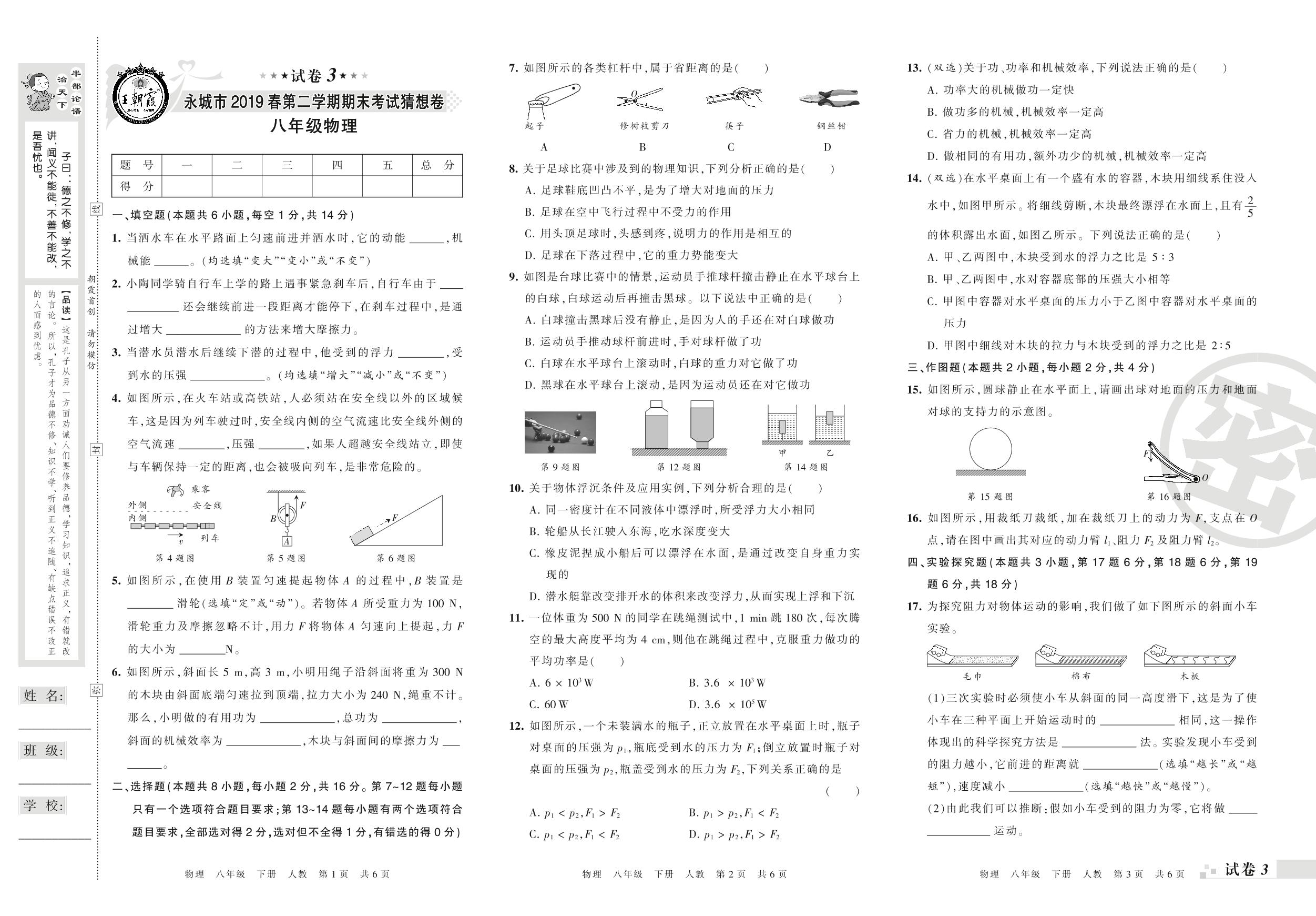 2019春第二学期永城市八年级物理试卷(人教版)【3】