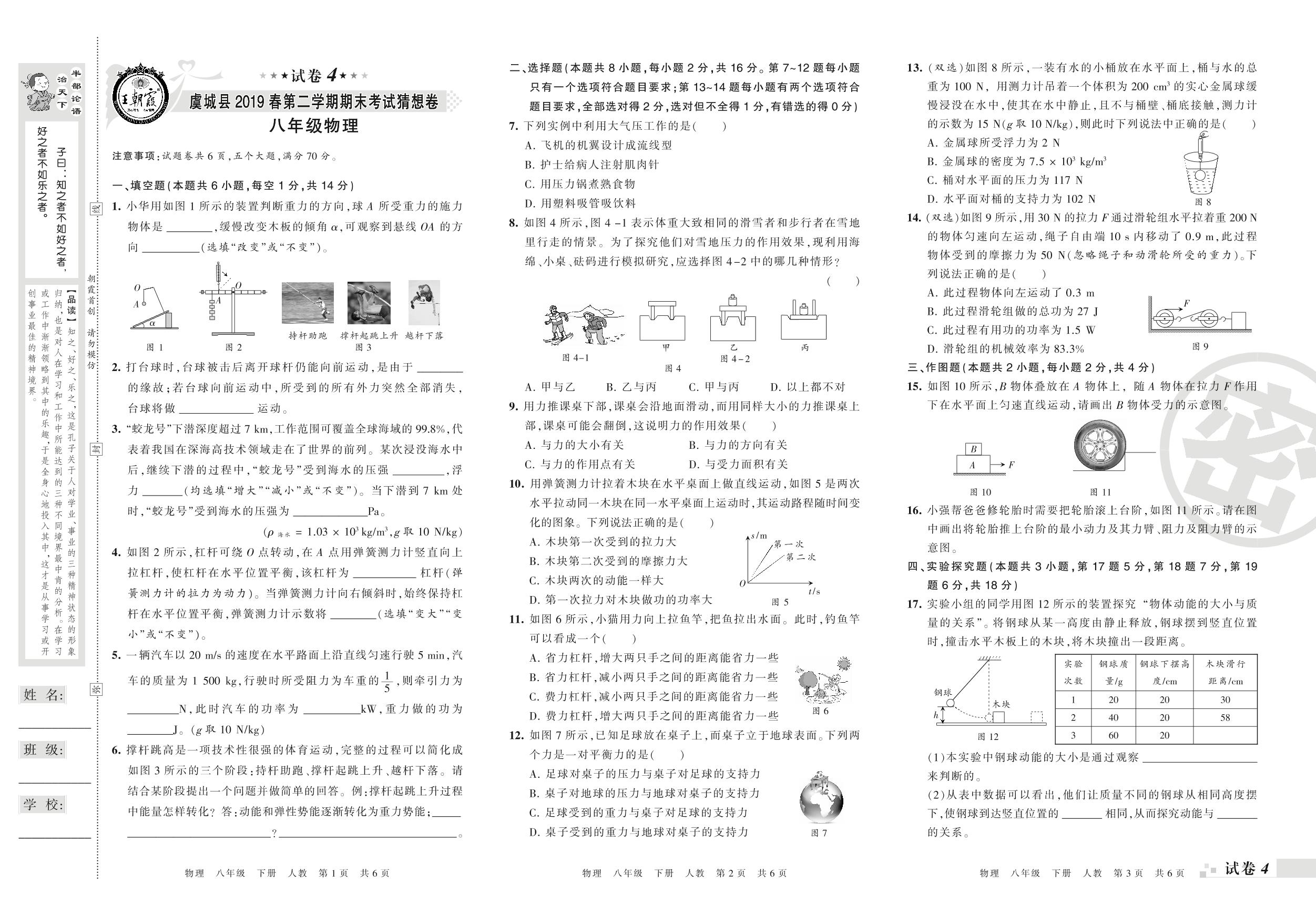 2019春第二学期商丘市虞城县八年级物理试卷(人教版)【4】