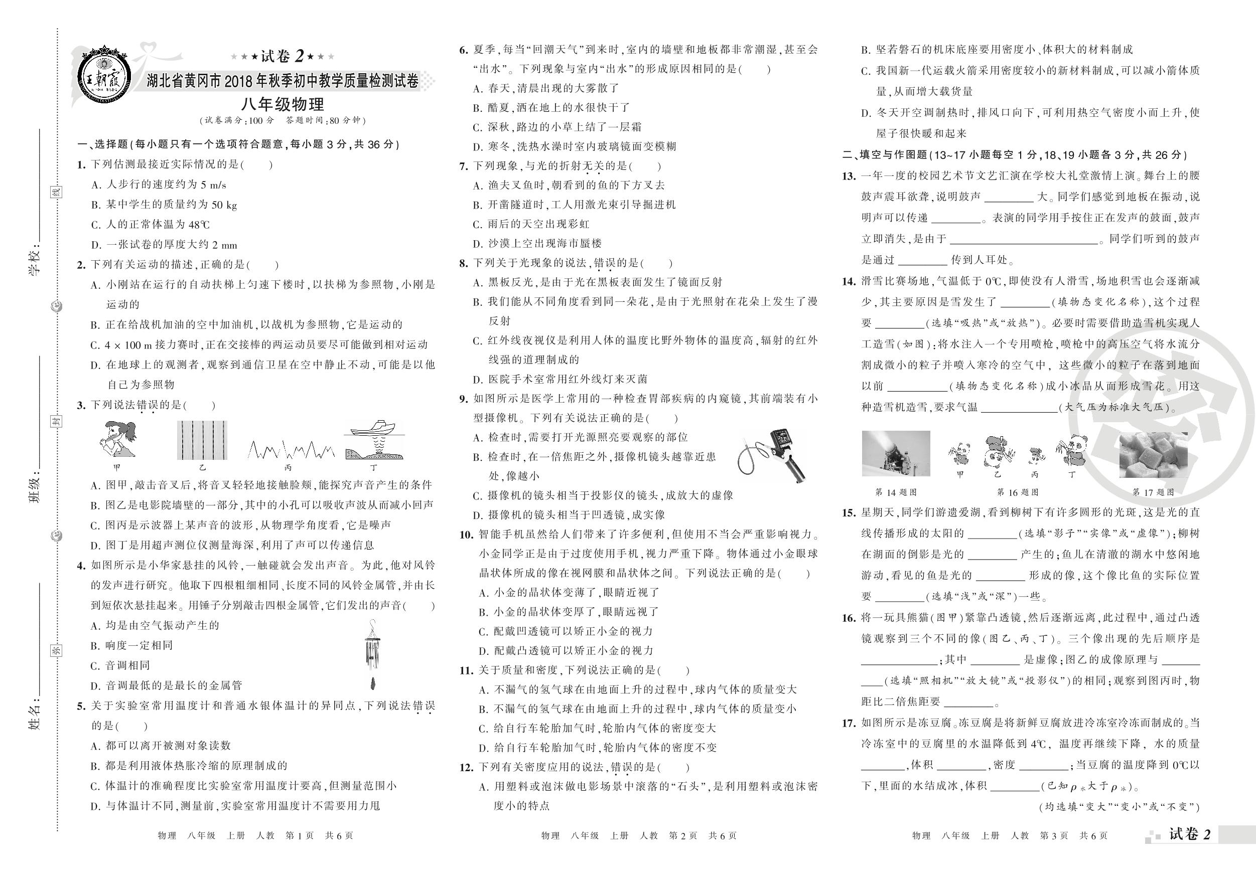 2018-2019学年第一学期湖北省黄冈市八年级物理试卷(人教版)【2】
