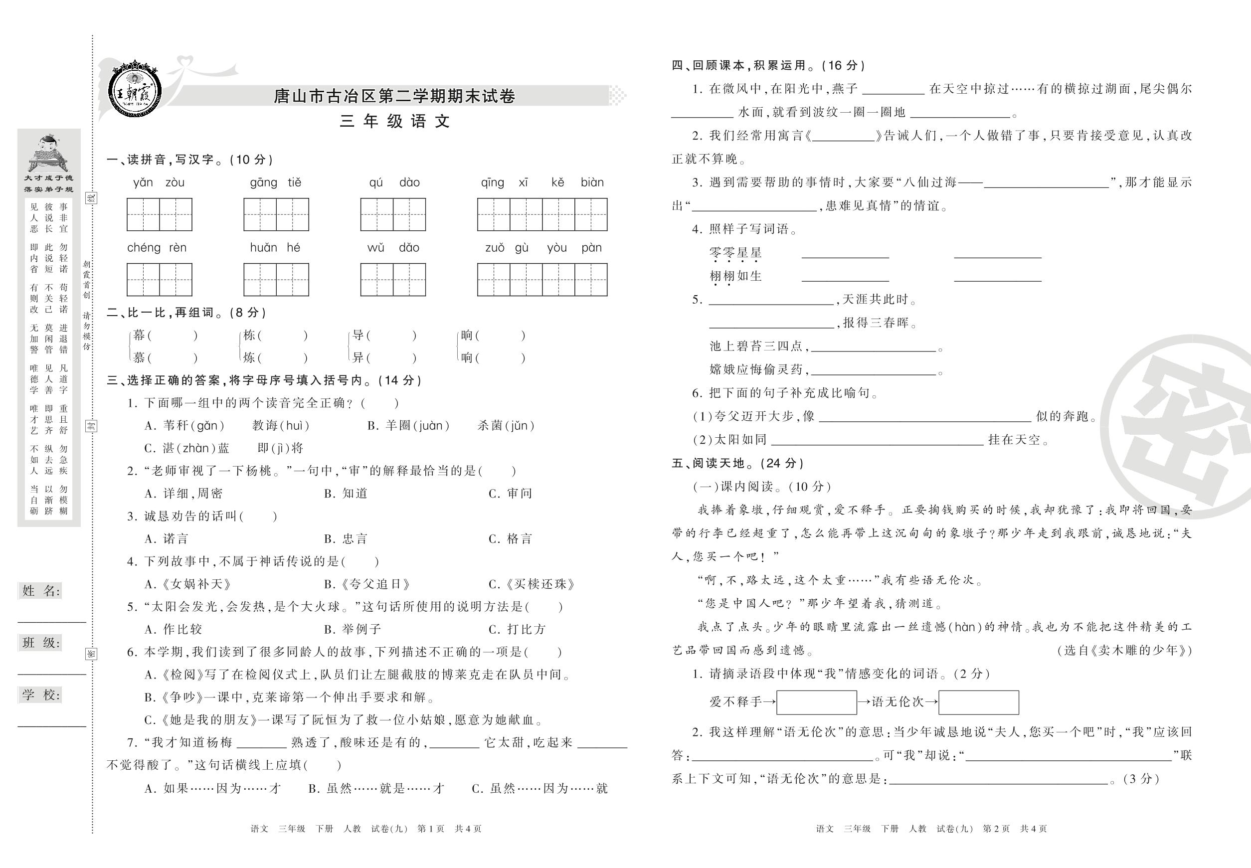 三年级语文人教版下册期末卷