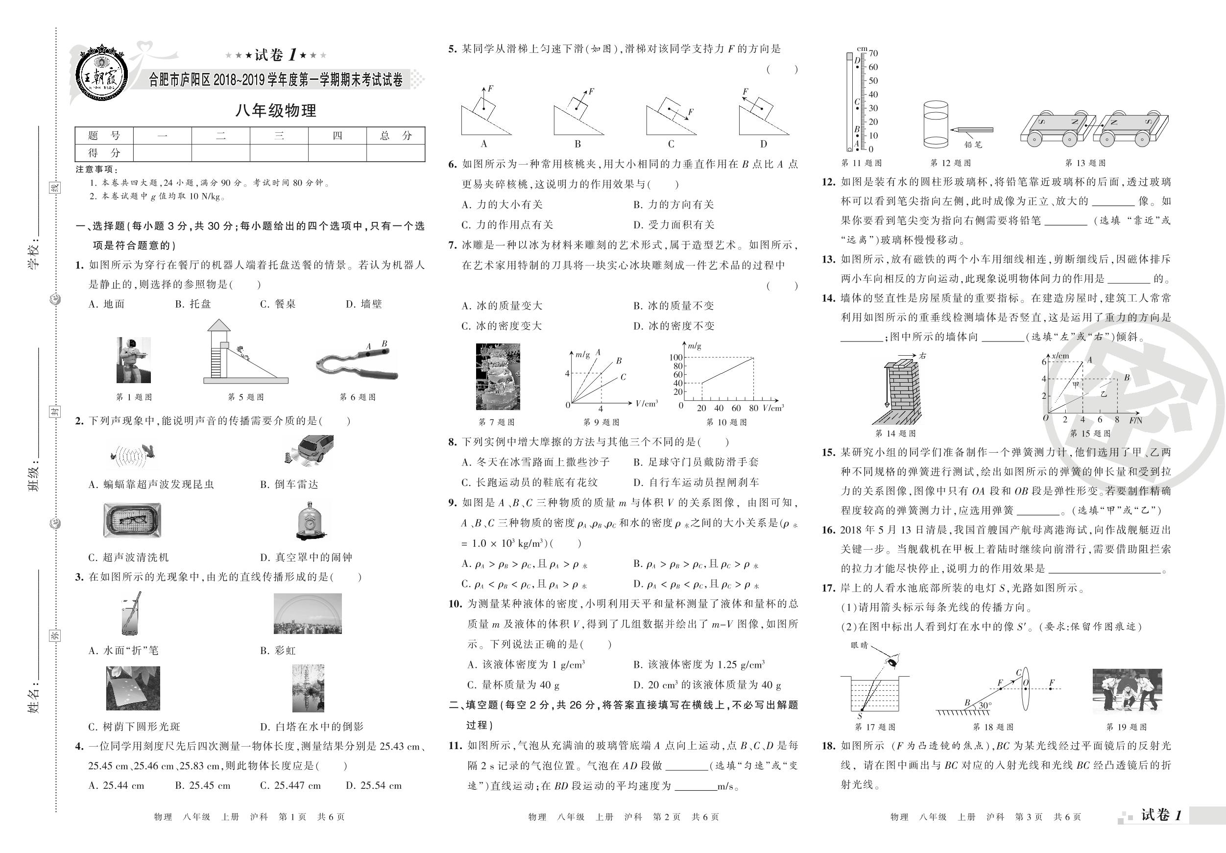 2018-2019学年第一学期合肥市庐阳区八年级物理试卷(沪科版)【1】