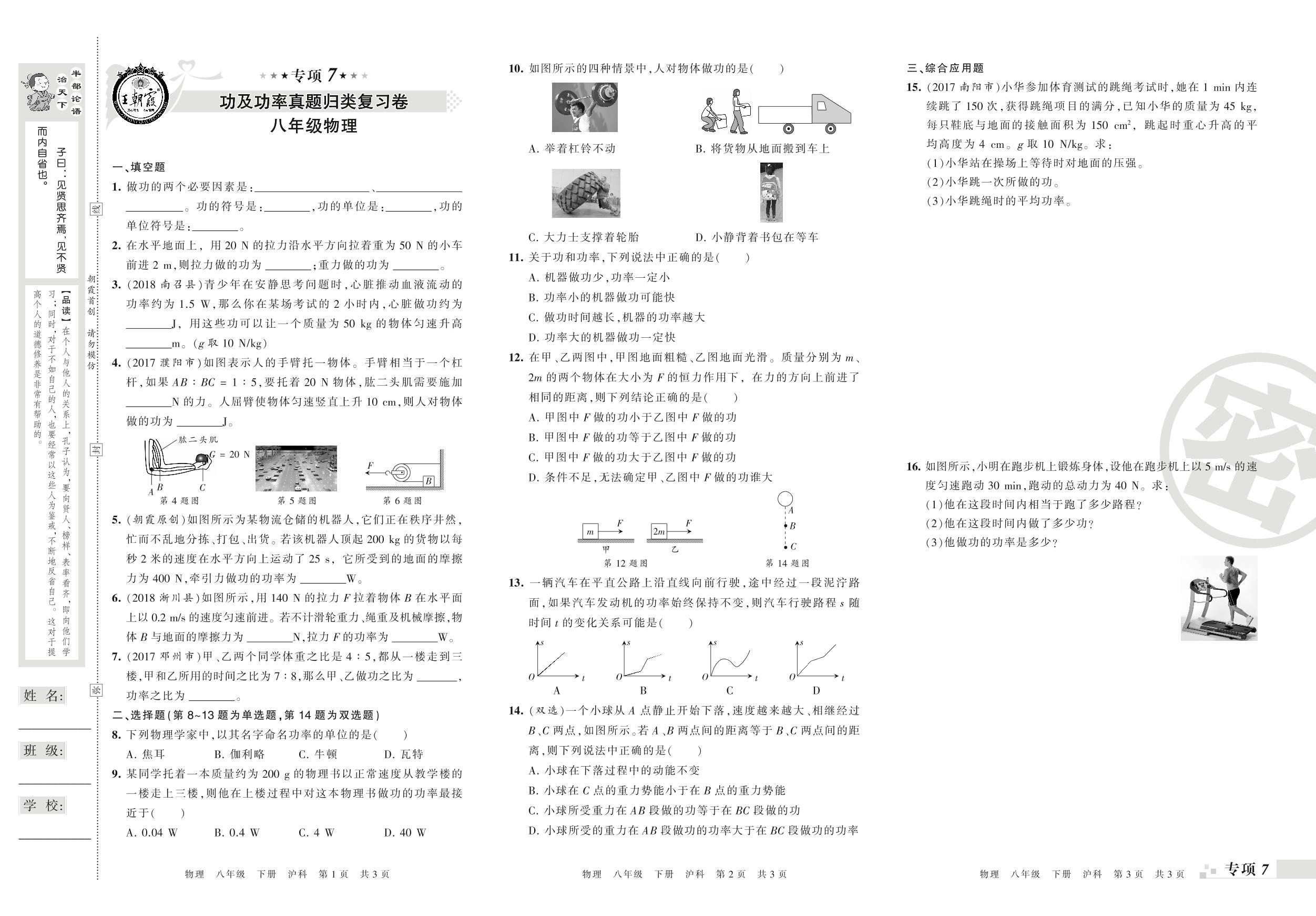 王朝霞期末专项卷——功及功率真题归类复习、机械效率及机械能真题归类复习八年级下册物理(沪科版)_R210810174547【0】