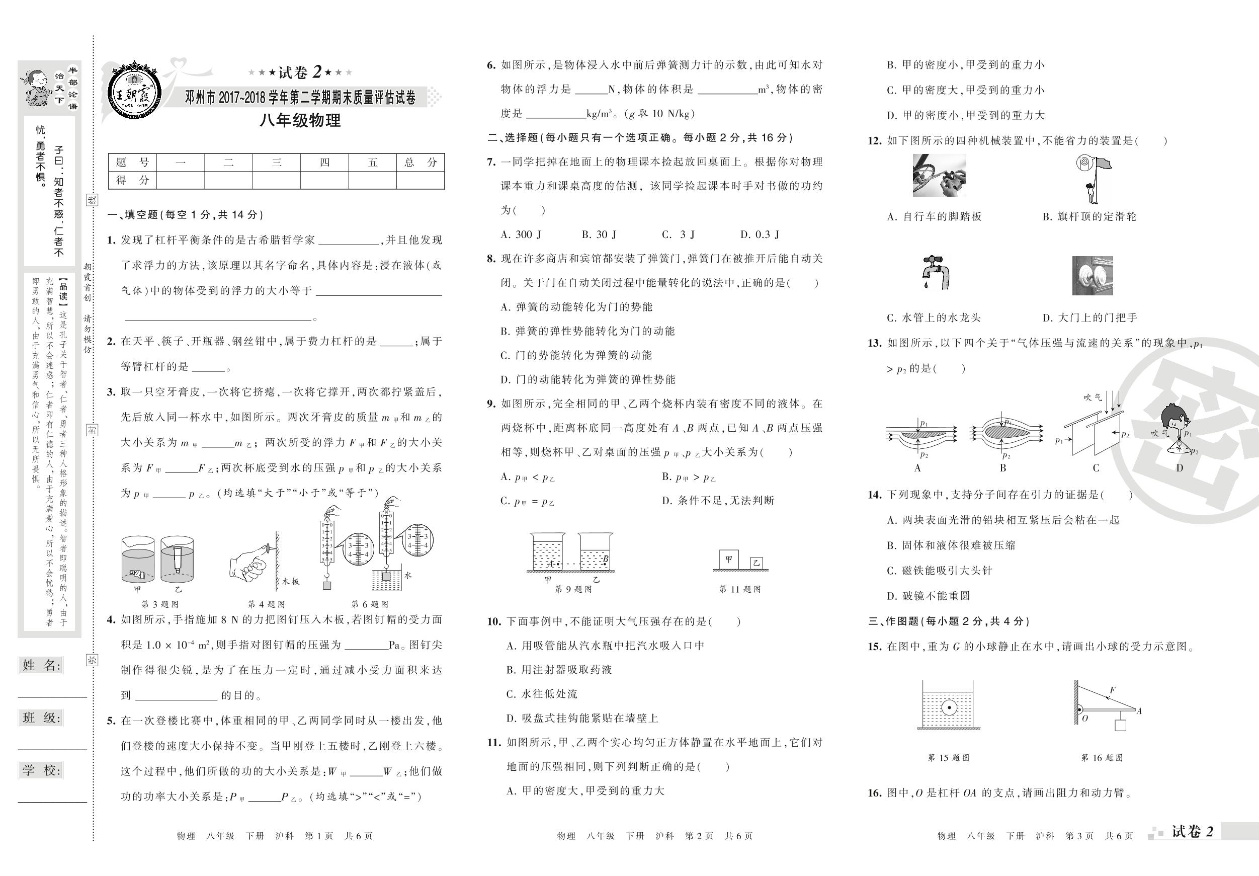 2017-2018学年第二学期邓州市八年级物理试卷(沪科版)【2】