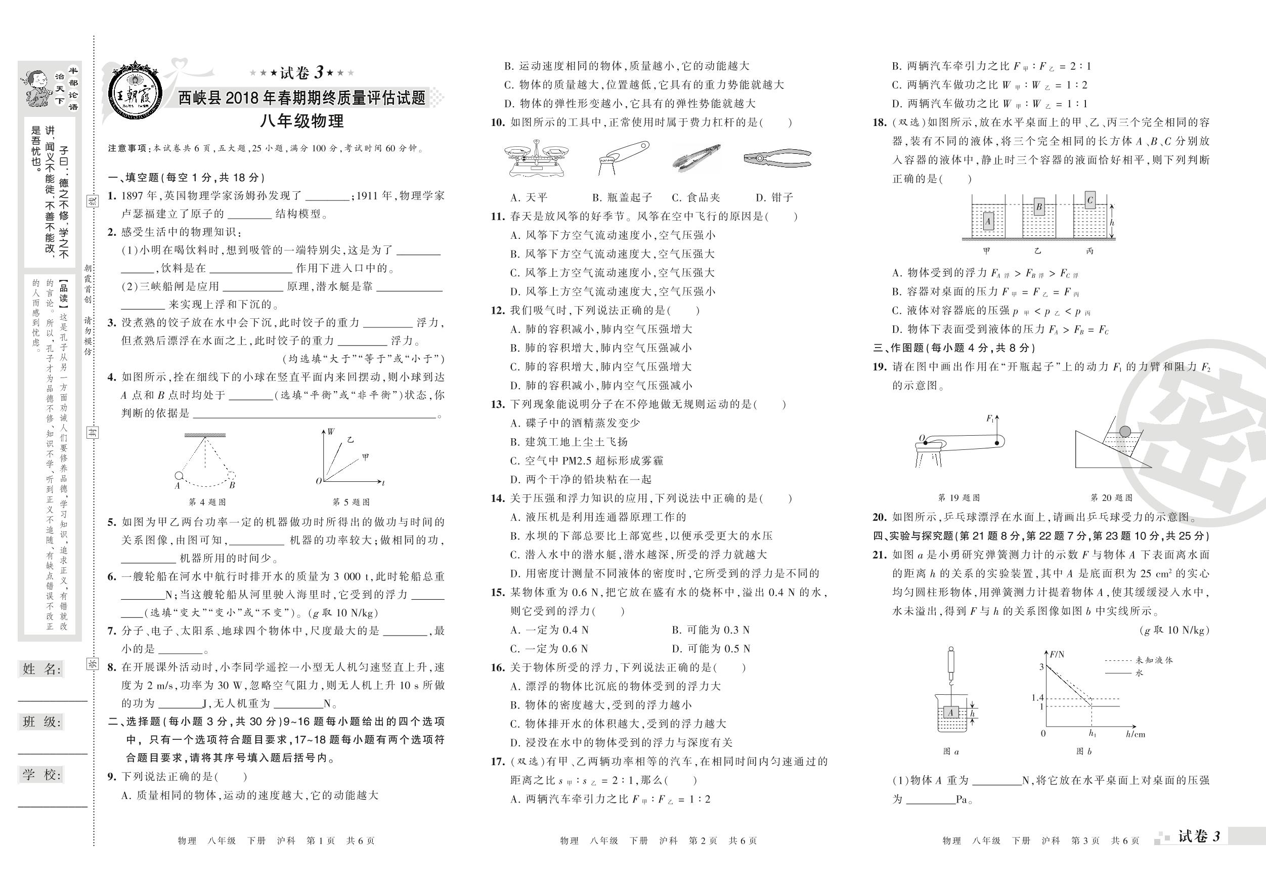 2017-2018学年第二学期南阳市西峡县八年级物理试卷(沪科版)【3】