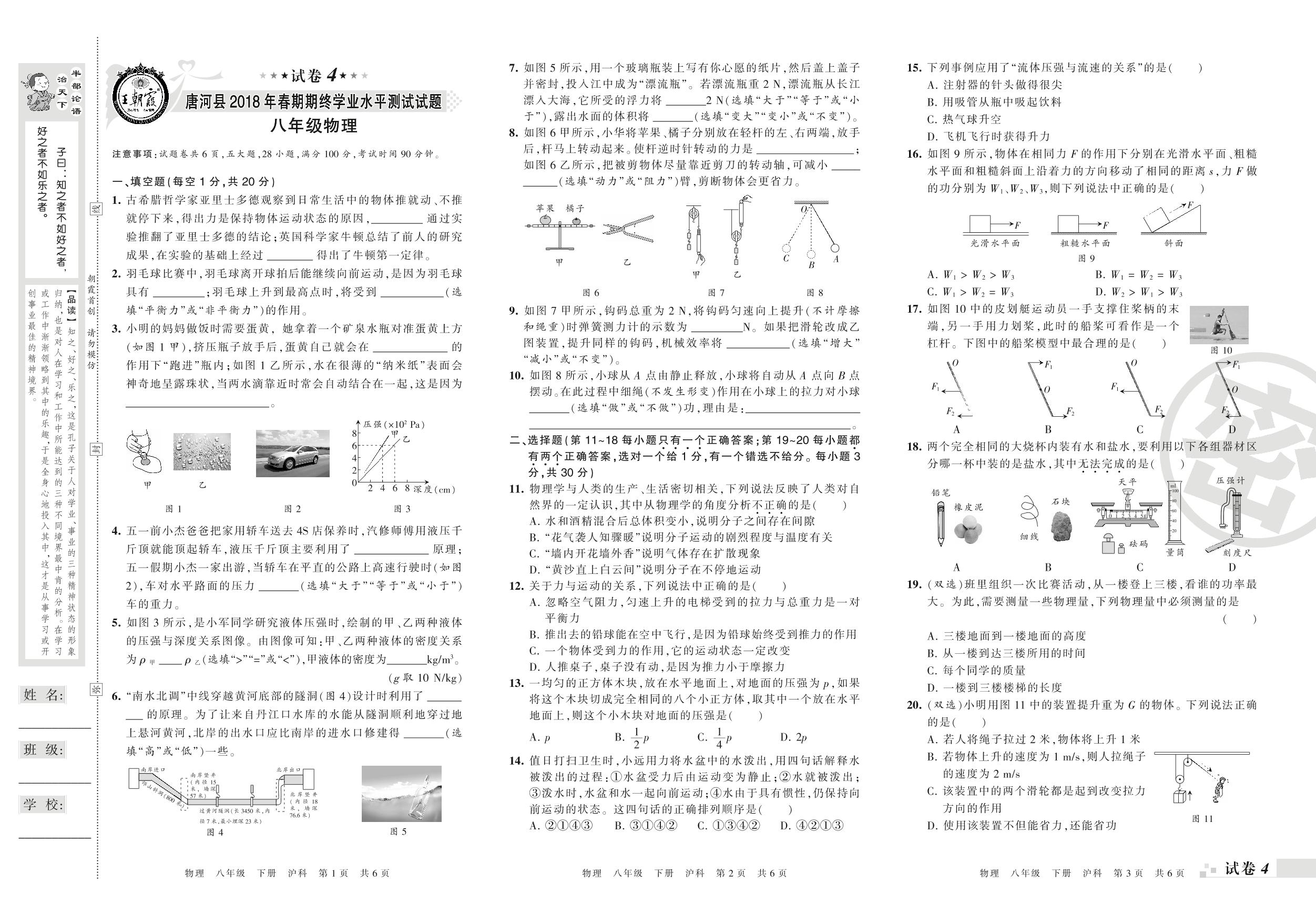 2017-2018学年第二学期南阳市唐河县八年级物理试卷(沪科版)【4】