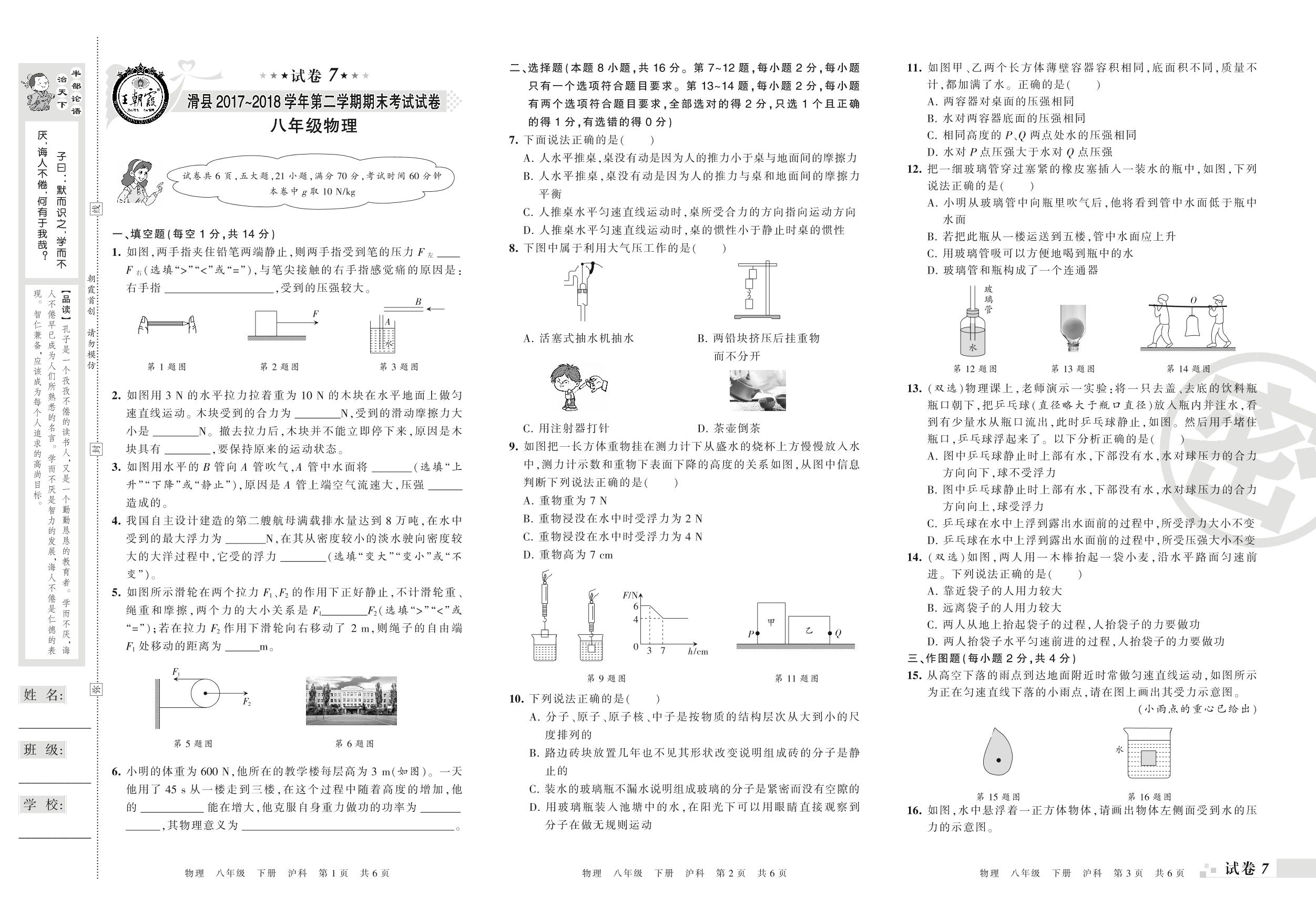 2017-2018学年第二学期安阳市滑县八年级物理试卷(沪科版)【7】