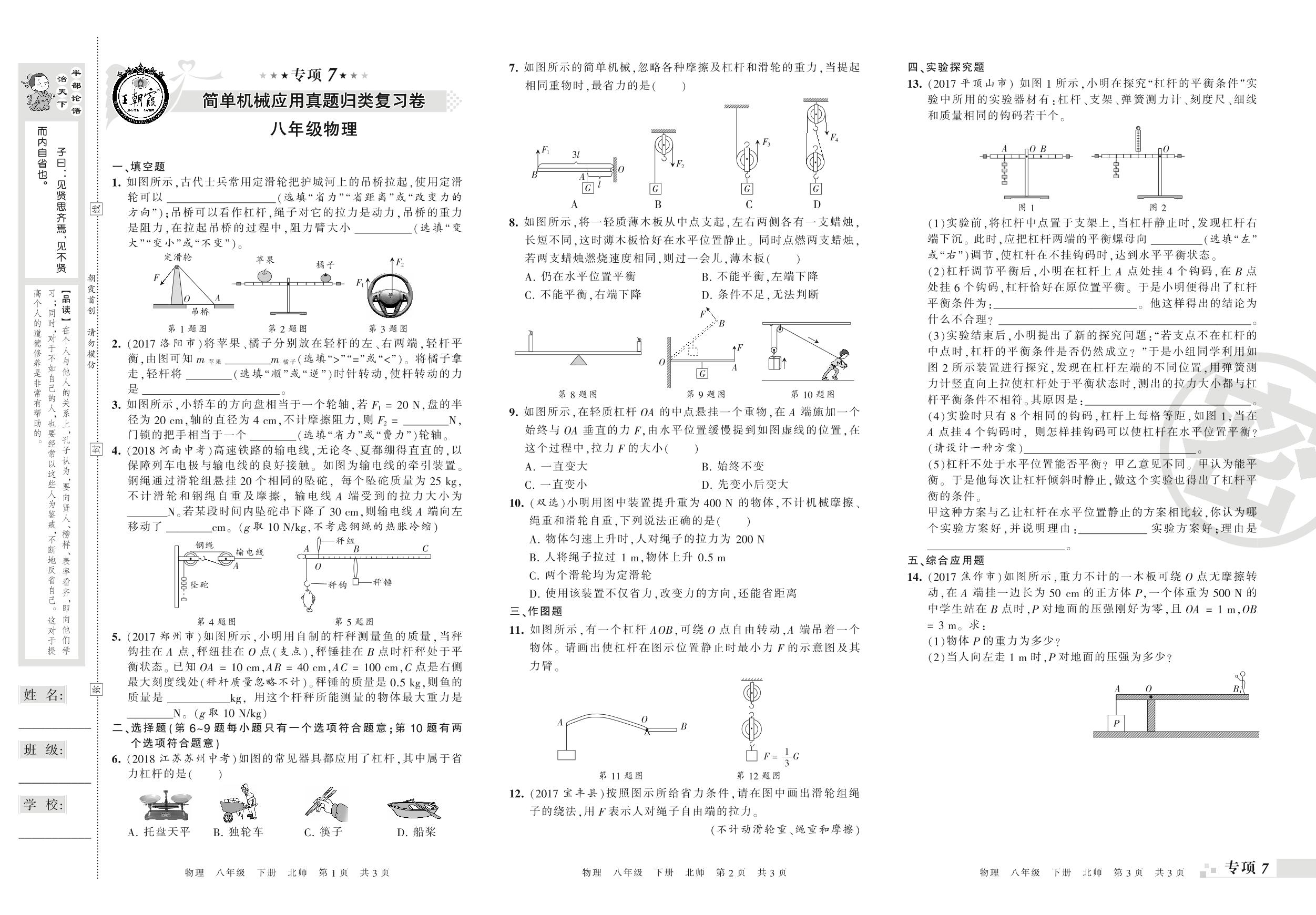 王朝霞期末专项卷——简单机械应用真题归类复习、功、功率、机械效率真题归类复习八年级下册物理(北师版)【0】