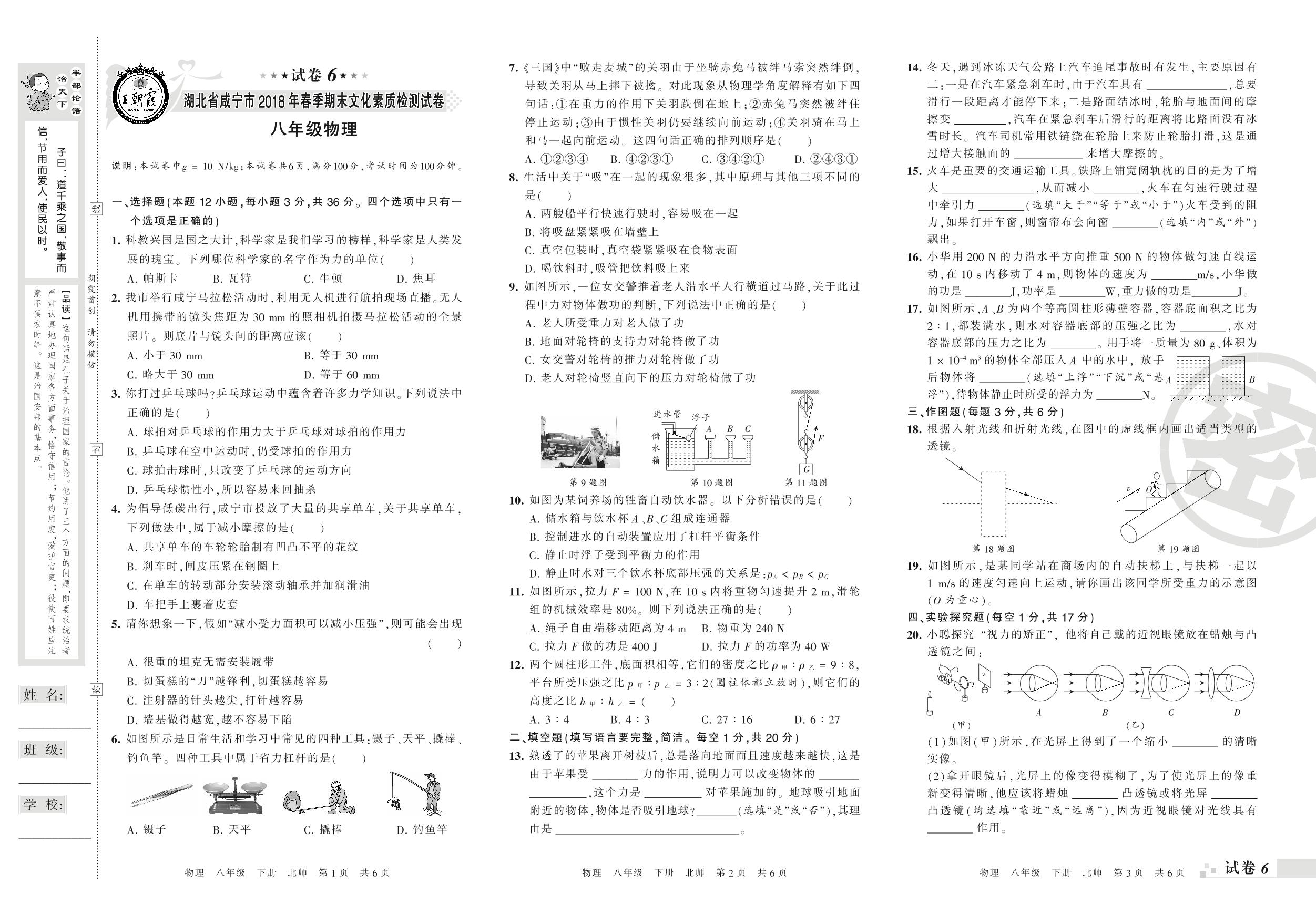 2017-2018学年第二学期湖北省咸宁市八年级物理试卷(北师版)【6】