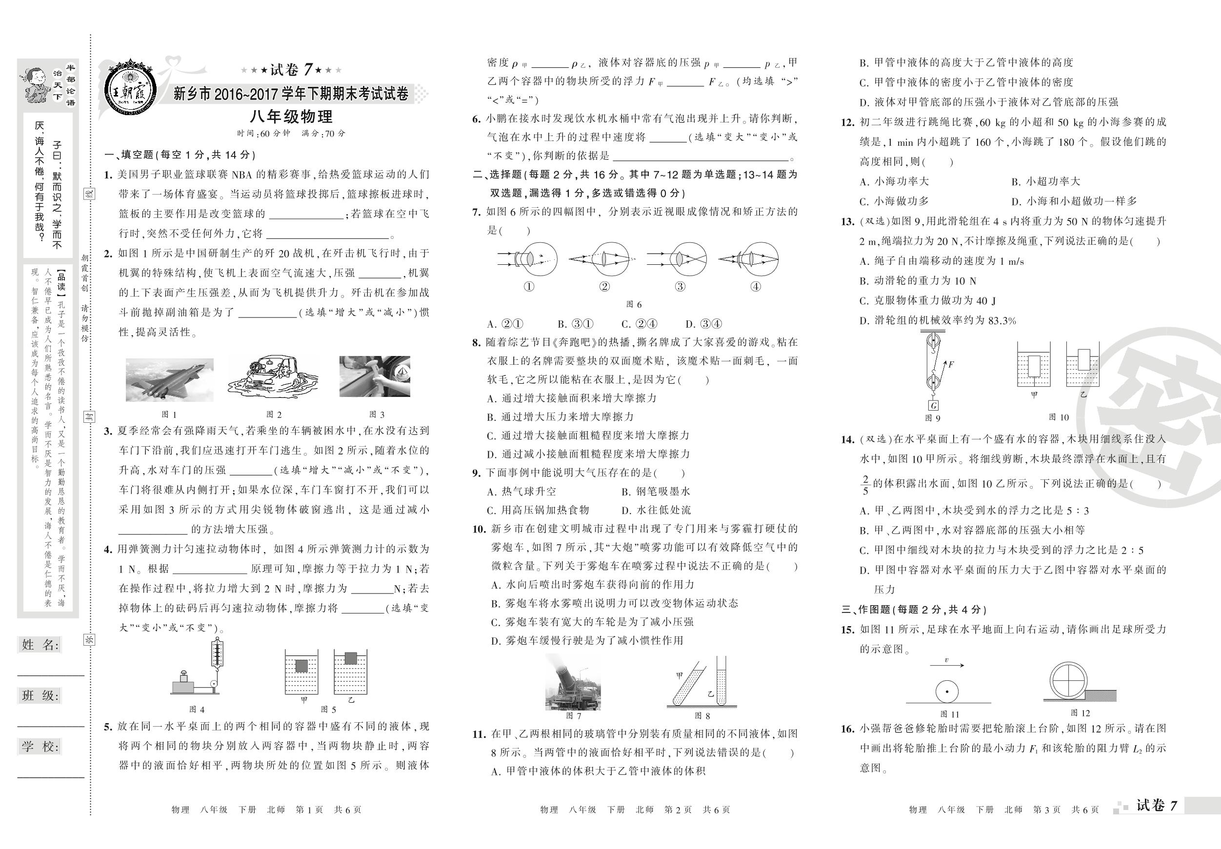 2016-2017学年第二学期新乡市八年级物理试卷(北师版)【7】